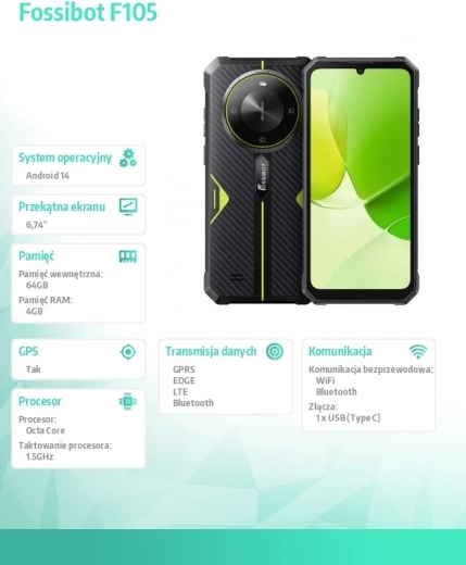 Odkryj wytrzymały smartfon Fossibot F105 z zielonymi akcentami, który łączy robustną konstrukcję, wielosoczewkowy aparat oraz duży wyświetlacz z wcięciem w kształcie kropli. Dzięki wzmocnionym rogom, pewnemu chwytowi i odpornemu korpusowi idealnie sprawdzi się w wymagających warunkach, a jednocześnie oferuje płynną pracę w aplikacjach i wysokiej jakości zdjęcia.