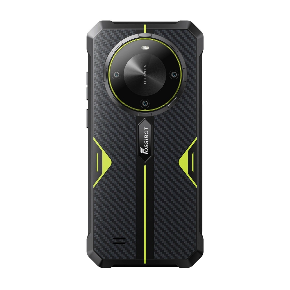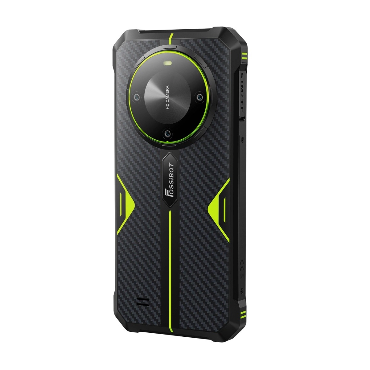 Okrągły moduł z kilkoma obiektywami i napisem „HD Camera” podkreśla możliwości telefonu w zakresie wykonywania szczegółowych zdjęć i nagrań. Praktyczny boczny przycisk z fakturą ułatwia odblokowanie i sterowanie, złącze USB‑C oraz uszczelnione sloty na karty SIM/TF zwiększają codzienną funkcjonalność.
