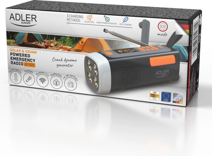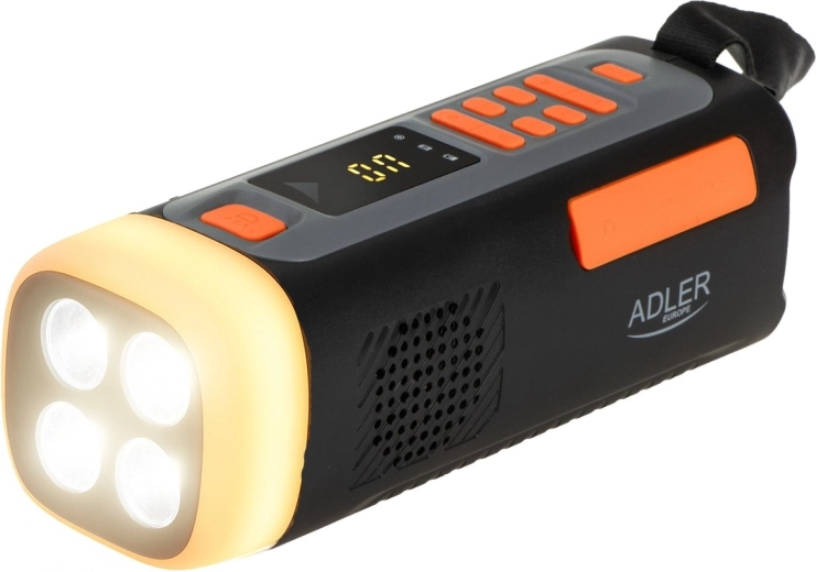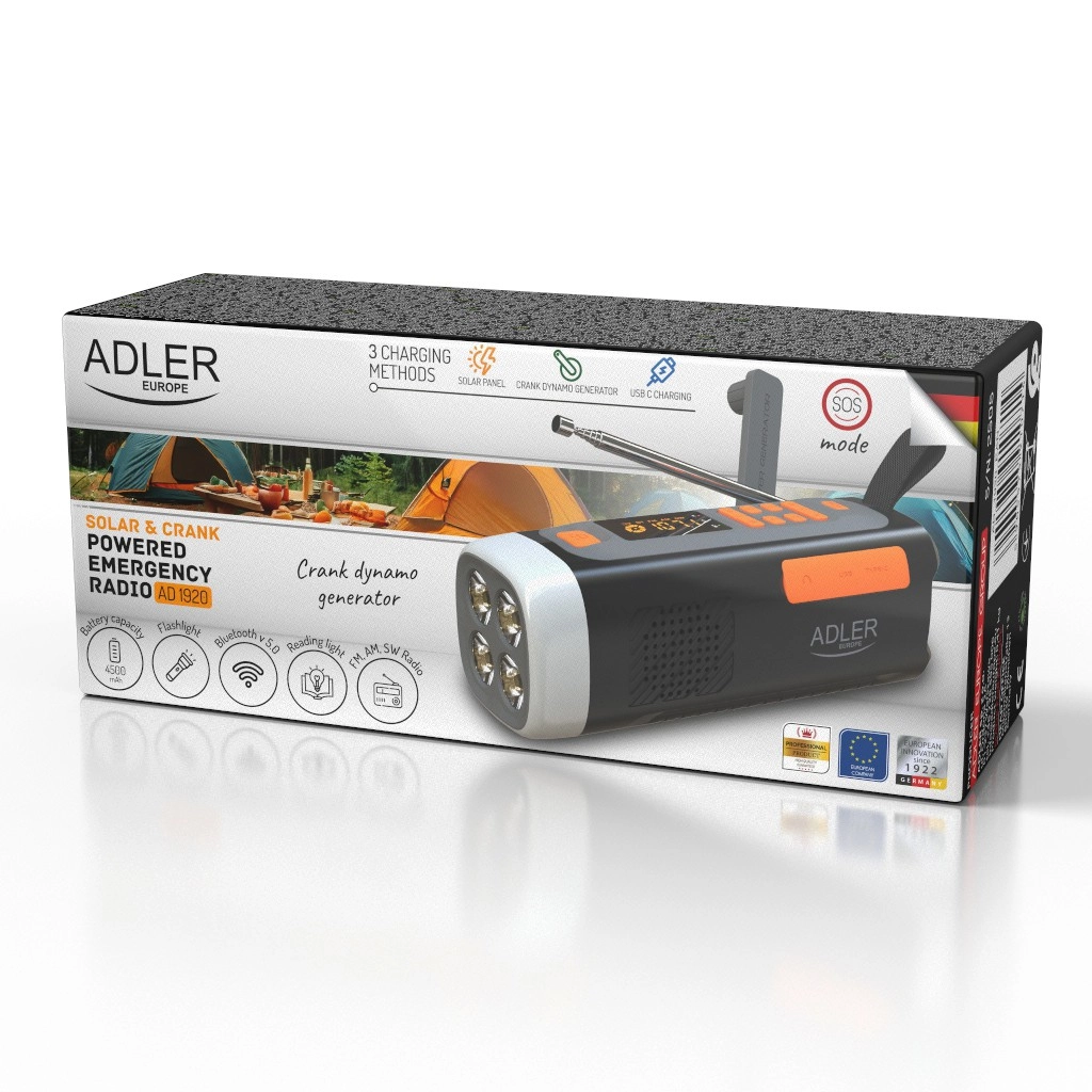 Wielofunkcyjne awaryjne radio ADLER AD 1920 łączy w sobie odbiornik FM/AM/SW, mocną latarkę LED 4 W, lampkę kempingową, powerbank 4500 mAh oraz Bluetooth 5.0. Dzięki trzem sposobom zasilania – panelowi solarnemu, ręcznej korbce (dynamo) i USB‑C – pozostaje funkcjonalne nawet podczas awarii prądu. Praktyczny tryb SOS, gniazdo 3,5 mm, wyświetlacz LED oraz kompaktowe wymiary czynią je idealnym wyborem na kemping, podróże i do wyposażenia awaryjnego.