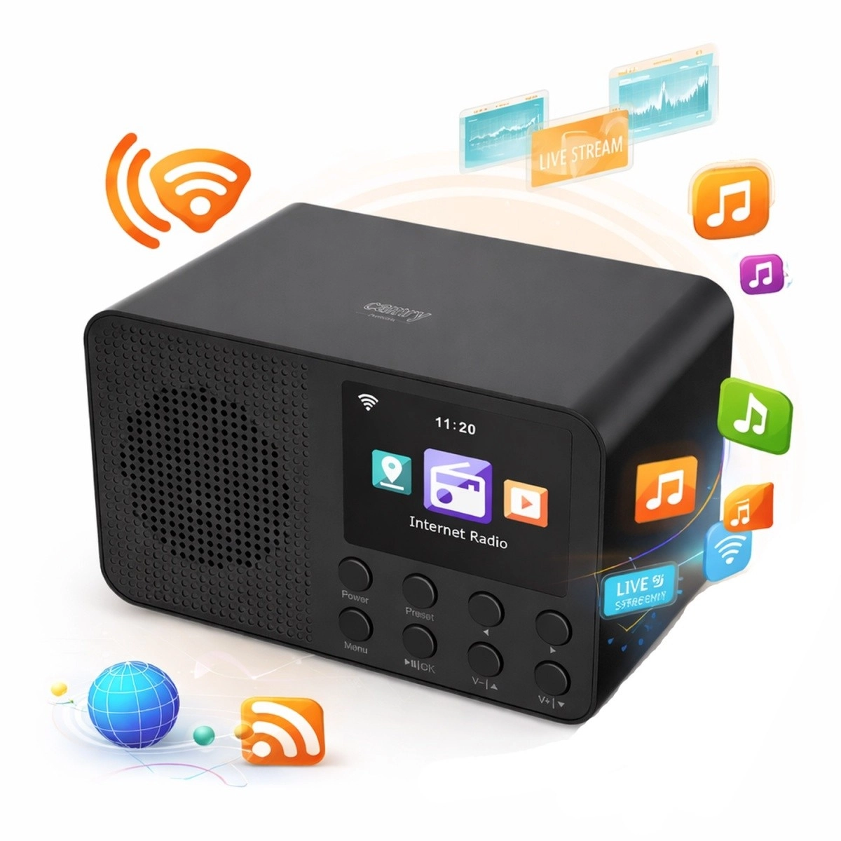 Otwórz się na świat muzyki z kompaktowym internetowym radiem CAMRY, które oferuje dostęp do 25 000+ stacji, stabilne Wi‑Fi 2,4 GHz, bezprzewodowe Bluetooth do streamingu oraz czytelny 2,4" kolorowy wyświetlacz TFT. Do tego podwójny budzik, sleep i drzemka, 99 ulubionych stacji, wyjście 3,5 mm i nowoczesne zasilanie USB‑C.