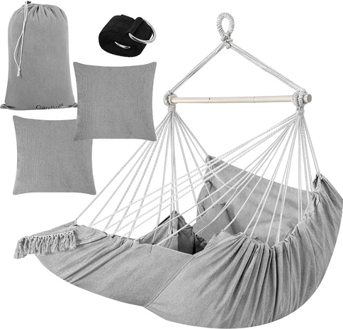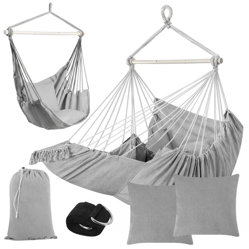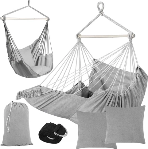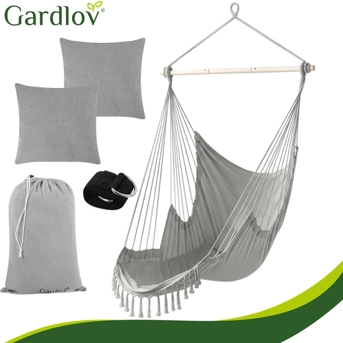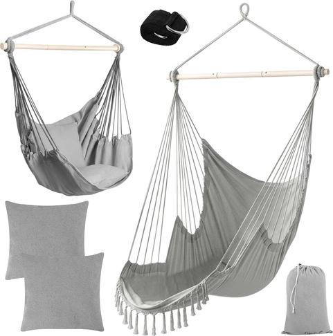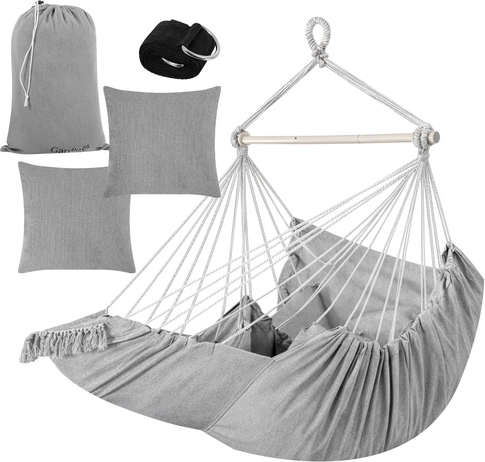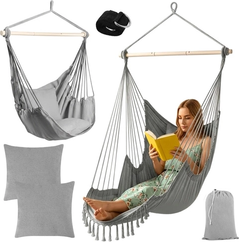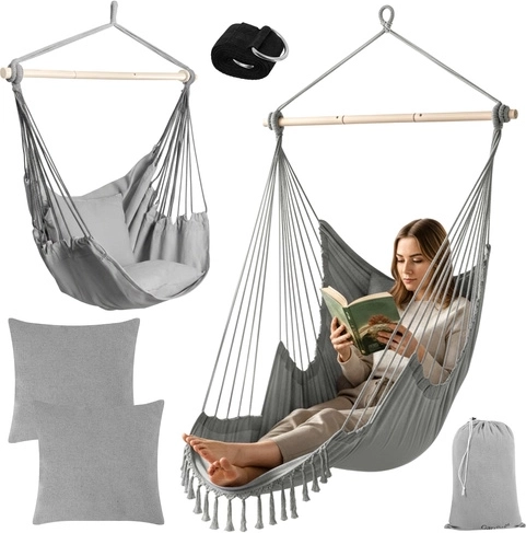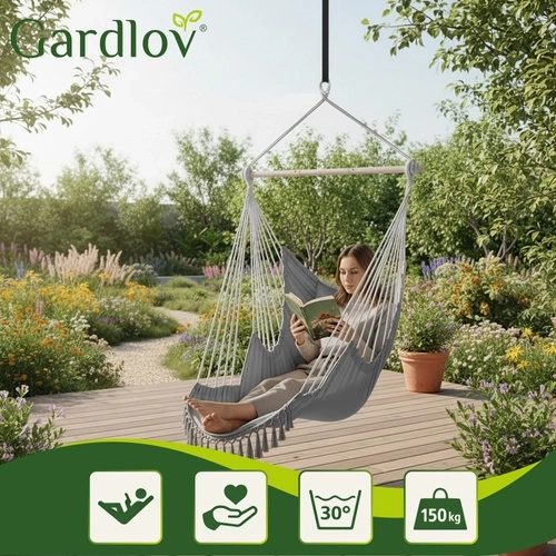 Ciesz się spokojnym relaksem w domu i na zewnątrz ze stylowym wiszącym fotelem hamakowym GARDLOV. Wytrzymała tkanina, stabilizująca belka i udźwig 150 kg zapewniają bezpieczne i wygodne bujanie. W zestawie znajdziesz 2 miękkie poduszki, pasek do zawieszenia oraz praktyczny pokrowiec ułatwiający przenoszenie. Idealny na balkon, taras, do ogrodu i salonu.