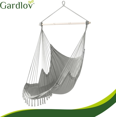 Wiszący fotel GARDLOV zamieni każdy kąt w przytulną strefę wypoczynku. Mocna bawełniana tkanina z domieszką poliestru przyjemnie otula ciało, a drewniany drążek rozporowy i wielopunktowe zawieszenie dbają o stabilność oraz wygodę siedzenia i półleżenia. Dzięki niskiej wadze 2,6 kg z łatwością przeniesiesz go między wnętrzem a ogrodem.