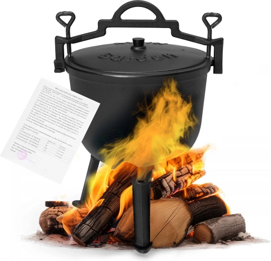 Masivne żeliwo zintegrowanymi nóżkami zapewnia stabilność nad żarzącymi się węglami oraz równomierne przekazywanie ciepła dla perfekcyjnie ugotowanego gulaszu czy zupy.