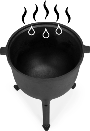 Mocny żeliwny kociołek ze stojakiem i pokrywką jest stworzony do gotowania na zewnątrz. Otwór kominowy w pokrywce pomaga regulować parę i kontrolować proces.