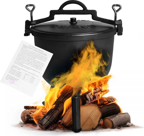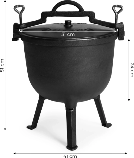 Solidny żeliwny kociołek o pojemności 15 l jest idealny do gotowania na otwartym ogniu, ogrodowych spotkań i biwakowania. Dzięki żeliwu doskonale akumuluje i równomiernie rozprowadza ciepło, sprawdza się do długo duszonych gulaszy, zup i pieczeni. W zestawie znajduje się pokrywka, stojak i praktyczny uchwyt dla bezpiecznego przenoszenia. Odkręcane nogi ułatwiają transport i po demontażu umożliwiają użycie także na kuchence gazowej.