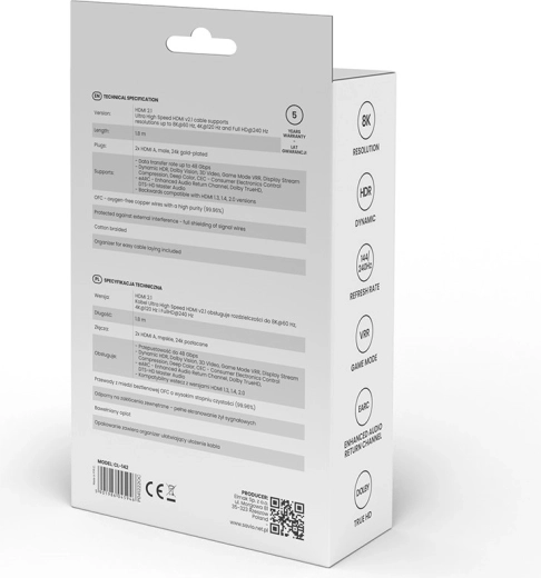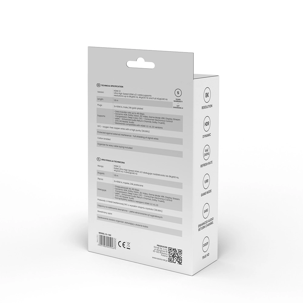 Wytrzymały nylonowy oplot z wzmocnieniem przeciw załamaniom wydłuża żywotność nawet przy częstym podłączaniu. Kabel wspiera nowoczesne standardy HDMI 2.1, takie jak eARC, HDR, VRR, ALLM, 3D i Ethernet, więc jest gotowy na obecne i przyszłe urządzenia AV.
