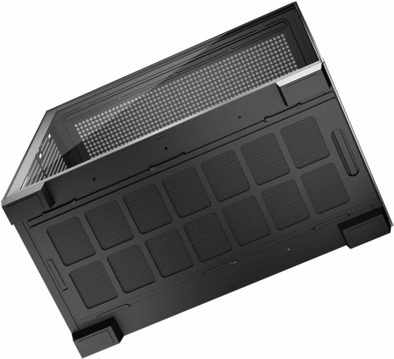 Przemyślana koncepcja przepływu powietrza łączy wentylowany górny panel, zasys powietrza z boku oraz dolny wlot. Unikalna składana ramka na wentylator 120 mm kieruje chłodne powietrze bezpośrednio na kartę graficzną, zapewniając niższe temperatury i cichszą pracę. Obudowa wspiera płyty ATX, mATX i ITX oraz jest przygotowana pod platformy z odwróconymi złączami (BTF).