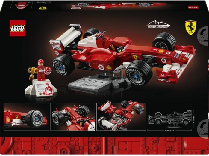Świętuj złotą erę F1 z ekskluzywnym zestawem LEGO Icons Ferrari F2004 i minifigurką Michaela Schumachera. Szczegółowy model legendarnego bolidu oferuje funkcjonalne sterowanie, realistyczny kokpit, rzędowy silnik V10 oraz opony Bridgestone Potenza z hamulcami. W zestawie znajduje się stojak ekspozycyjny ze statystykami, minifigurka z kaskiem i trofeum oraz stylowe podium z nadrukiem i cytatem. Świetny prezent dla fanów F1 i elegancki element do ekspozycji.
