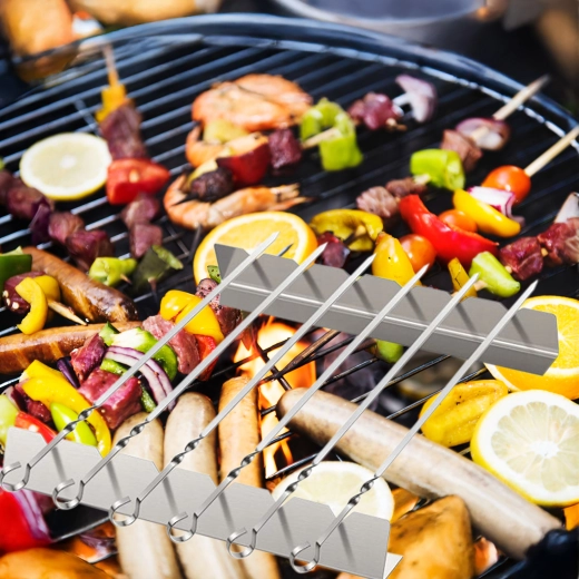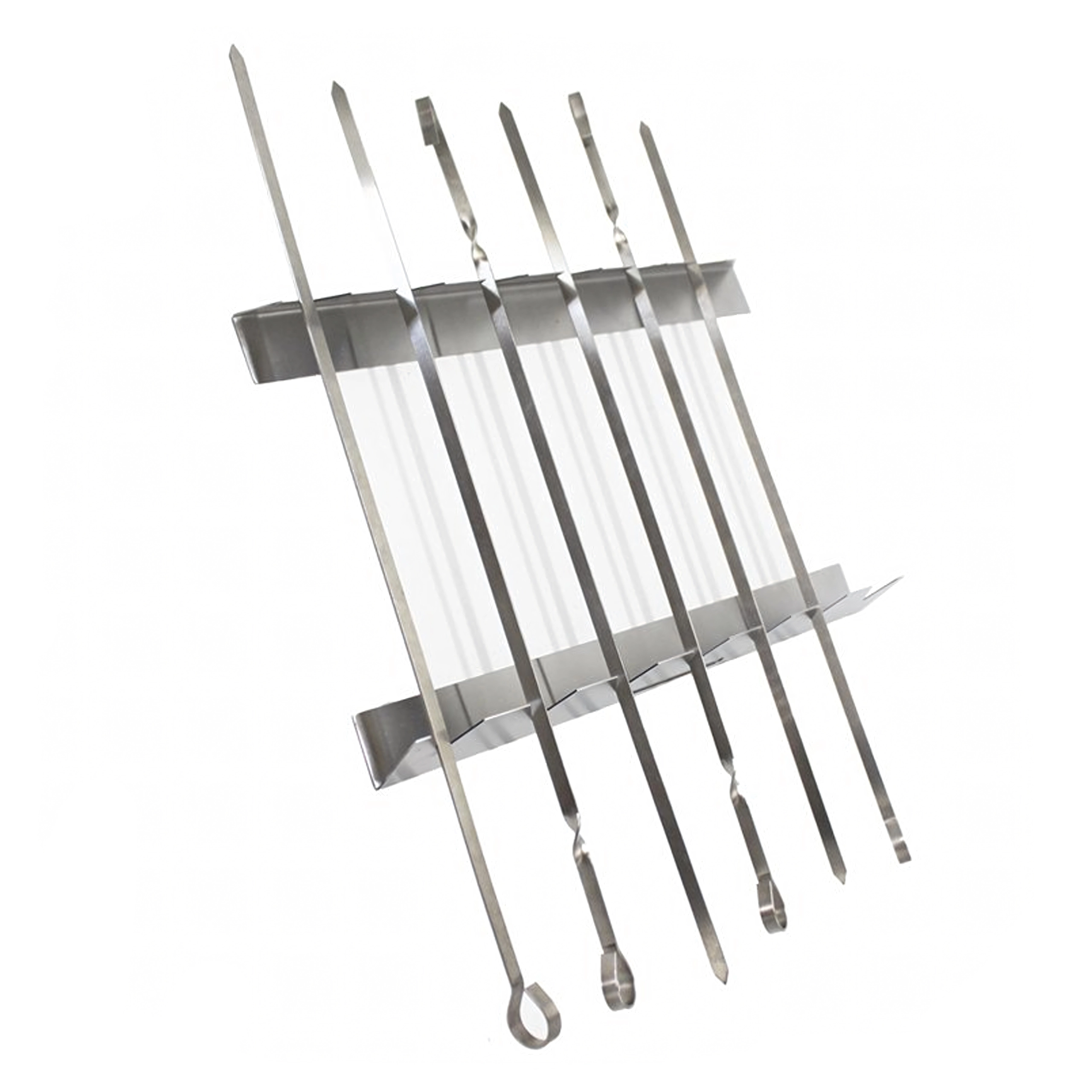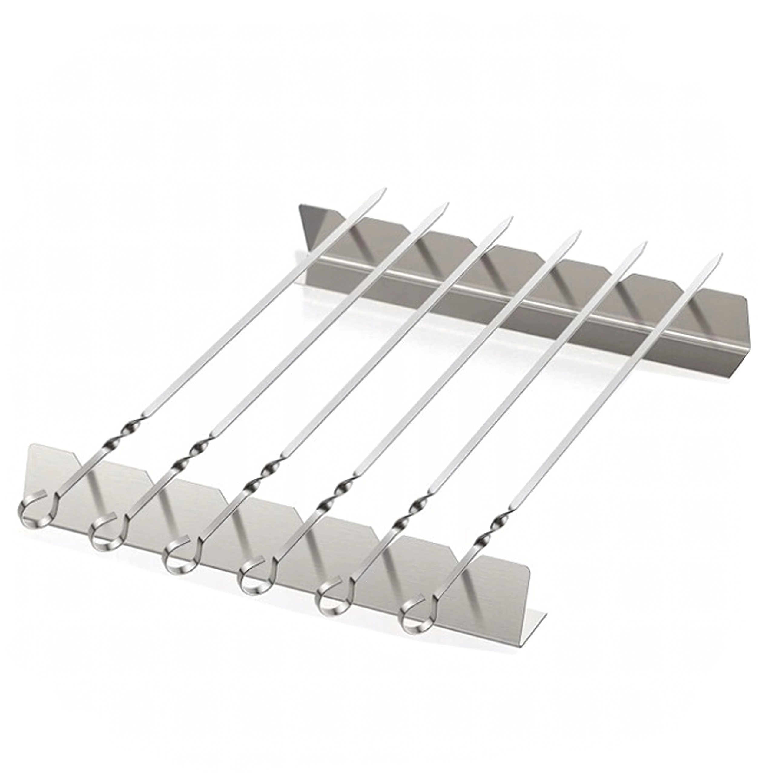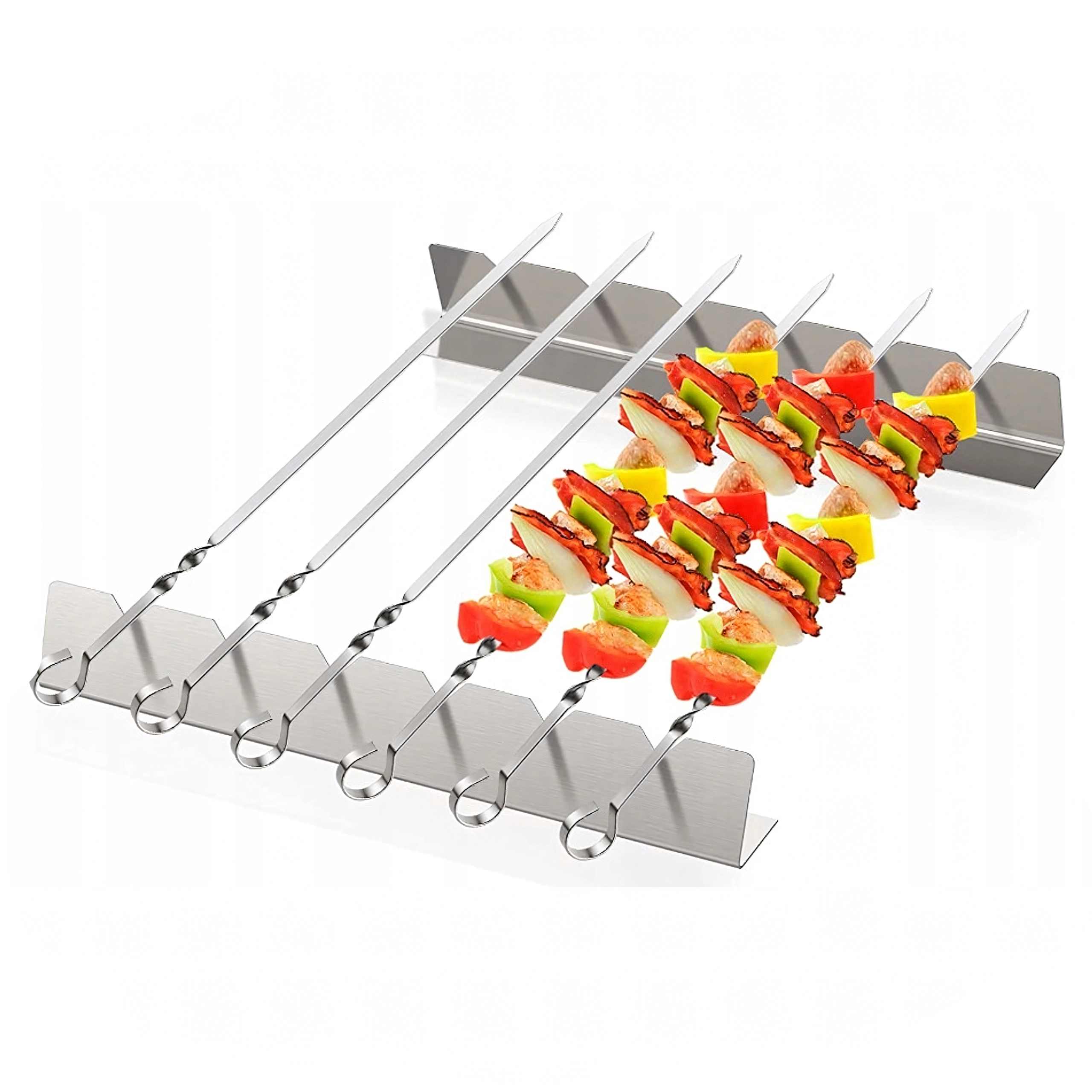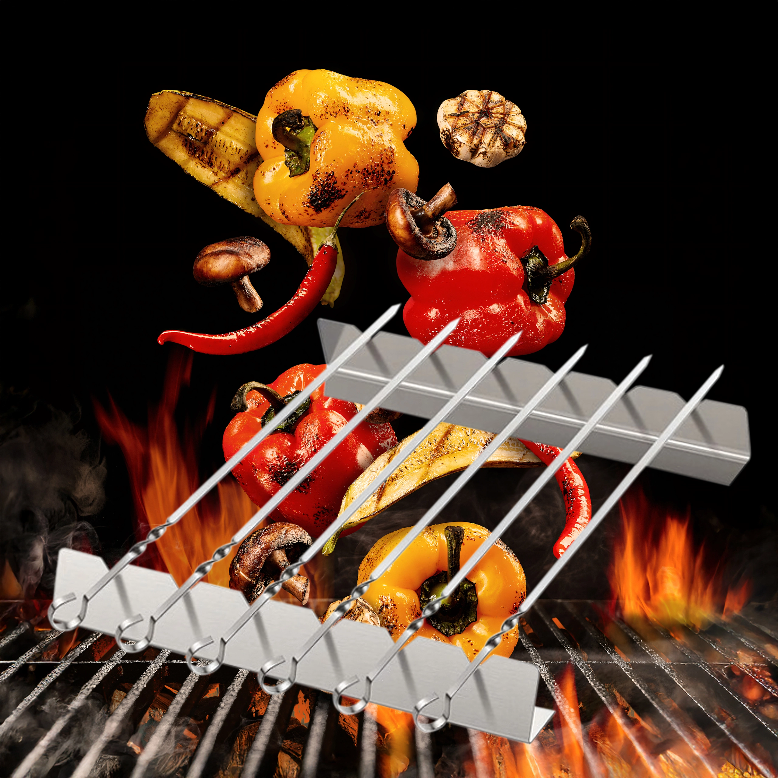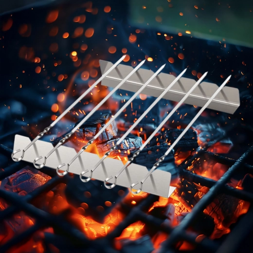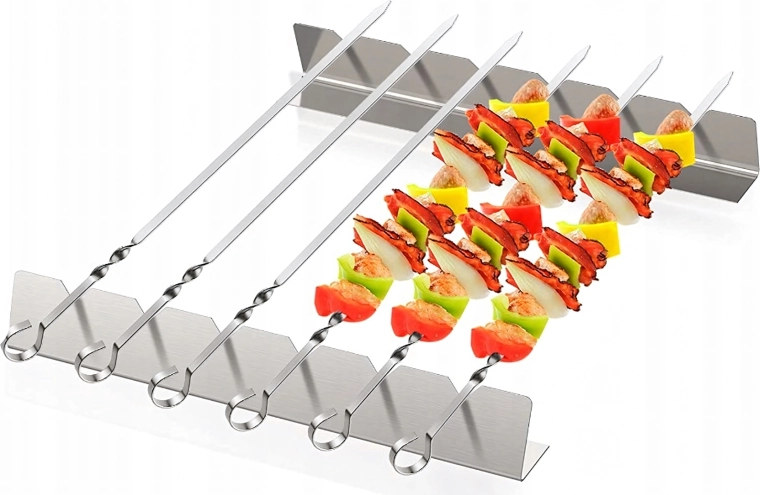 Ten wysokiej jakości zestaw szpikulców ze stali nierdzewnej został zaprojektowany do wygodnego i równomiernego grillowania mięsa, warzyw oraz owoców morza. Płaskie ostrza zapobiegają obracaniu się produktów, a stojak z podniesioną wysokością utrzymuje szpikulce nad żarem, zapewniając równomierne dopieczenie bez przypiekania.