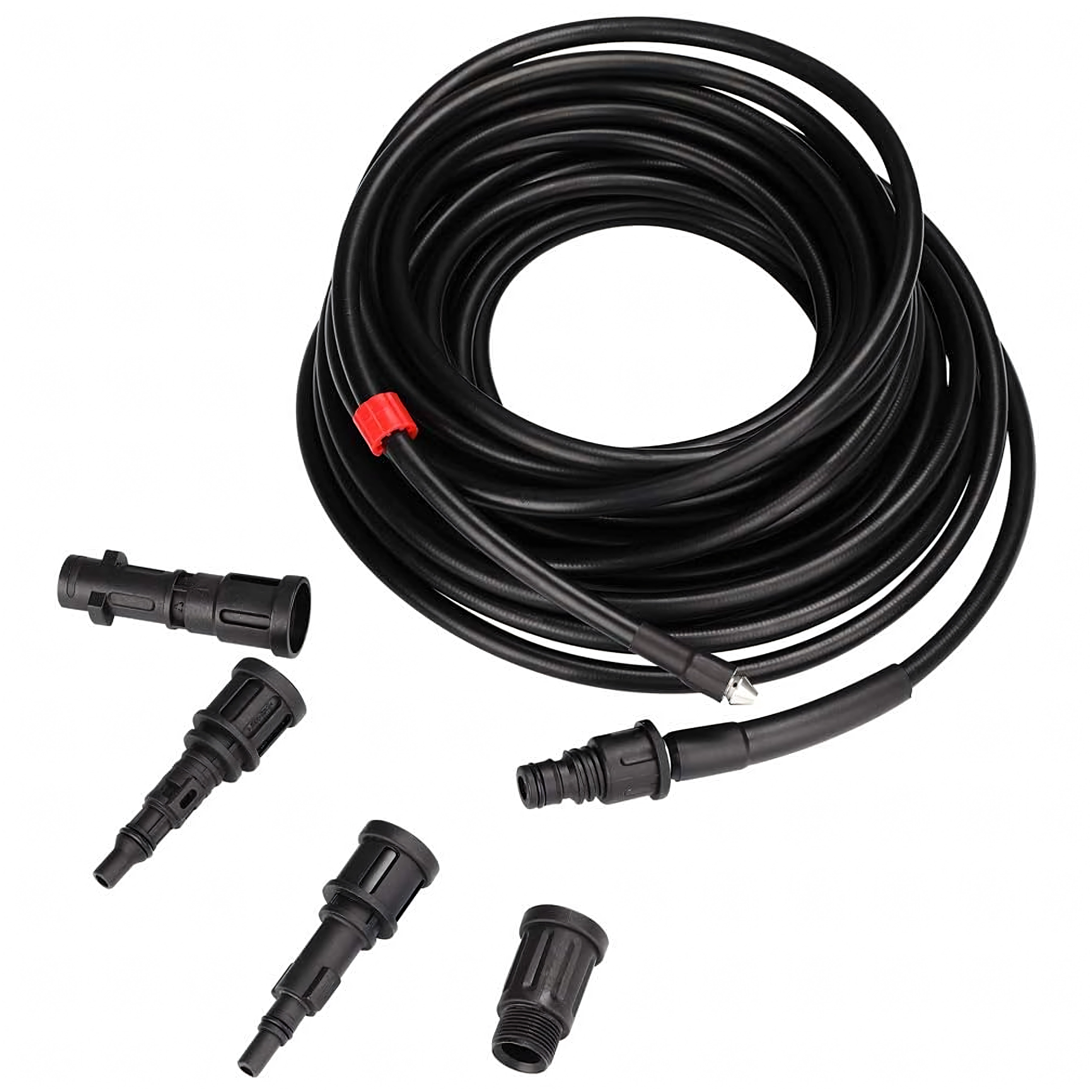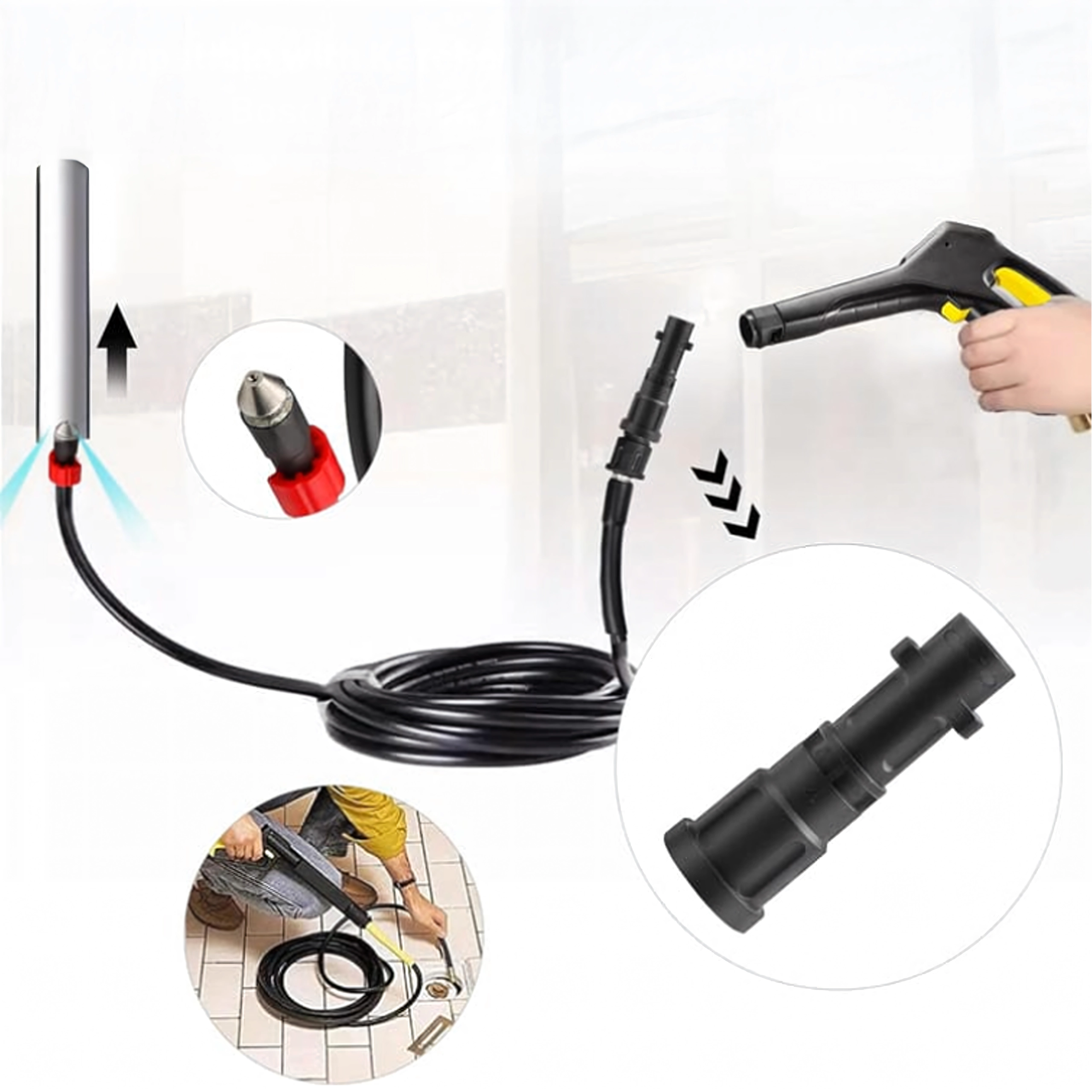 W zestawie znajdują się wymienne adaptery, które zwiększają kompatybilność z różnymi markami i typami myjek ciśnieniowych. Wąż zaprojektowano tak, aby łatwo przechodził przez łuki i kolanka rur, a dzięki dyszom wstecznym poruszał i wypłukiwał zanieczyszczenia.