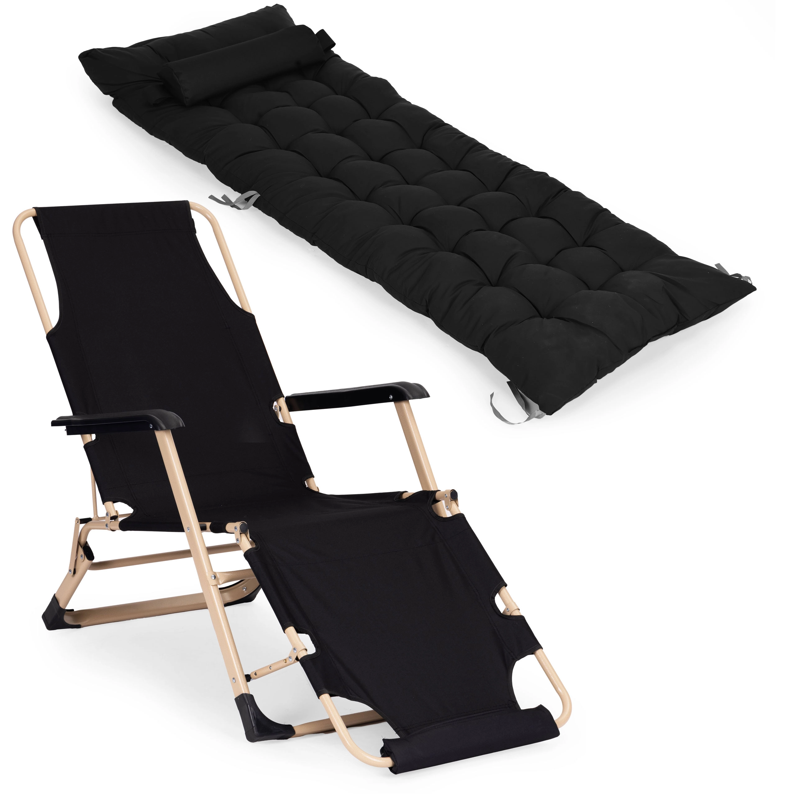 Ciesz się wygodą w ogrodzie, na tarasie i na plaży dzięki temu uniwersalnemu leżakowi/fotelowi 2 w 1. Oferuje solidną stalową ramę malowaną proszkowo, miękką pikowaną poduszkę z zagłówkiem oraz podnóżek z 3-stopniową regulacją. Stabilność zapewniają antypoślizgowe stopki, wytrzymałe materiały są odporne na wilgoć, a cały leżak ma składaną konstrukcję ułatwiającą przenoszenie i przechowywanie. Udźwig do 150 kg.