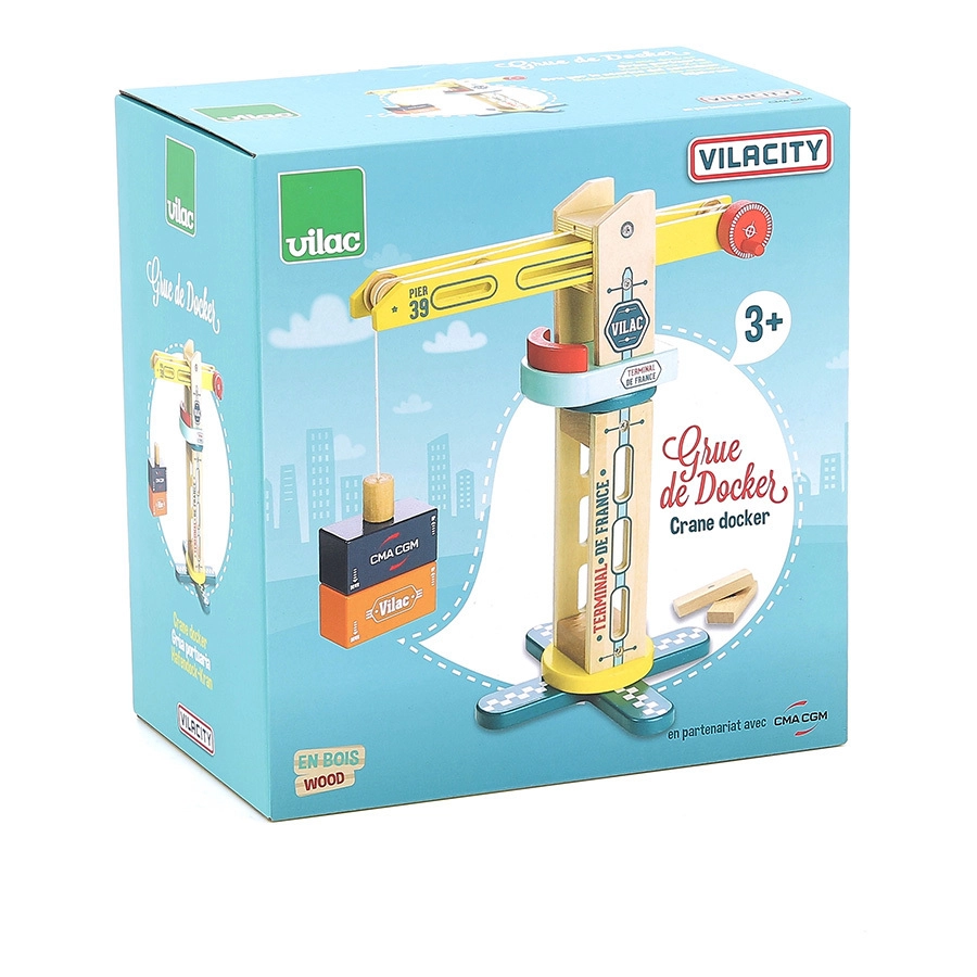 Odkryj zabawę w porcie z drewnianym żurawiem Vilac Vilacity, który dzięki magnetycznemu chwytowi z łatwością przenosi kontenery. Żuraw jest obrotowy, umożliwia pionowe i poziome przemieszczanie ładunku i jest w pełni kompatybilny z kolekcją Vilacity. Wykonany ekologicznie i przyjaźnie dla środowiska.