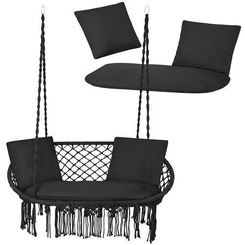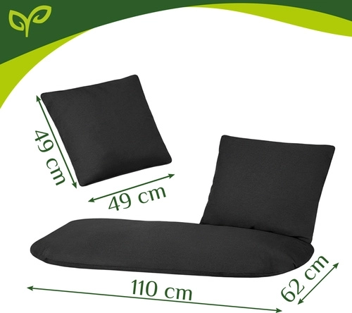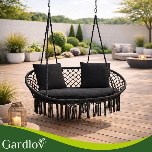 W zestawie znajduje się duże siedzisko dla dwóch osób oraz 2 miękkie jaśki dla podparcia pleców i głowy. Dzięki precyzyjnemu kształtowi poduszka wypełnia powierzchnię siedziska i poprawia stabilność siedzenia. Uniwersalny czarny design świetnie pasuje do większości aranżacji – od nowoczesnych tarasów po przytulne altany.