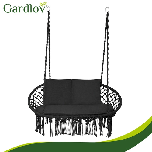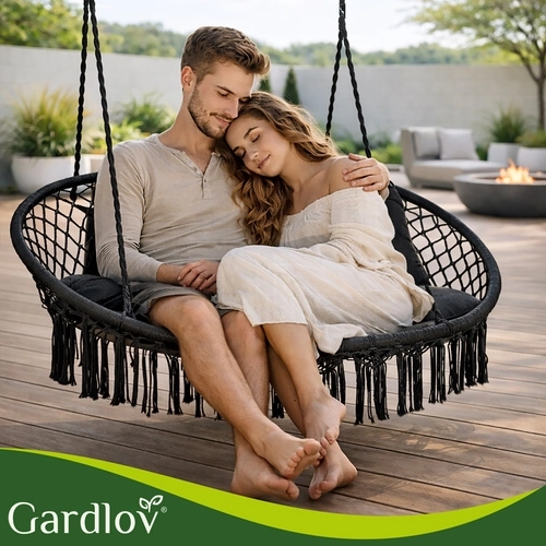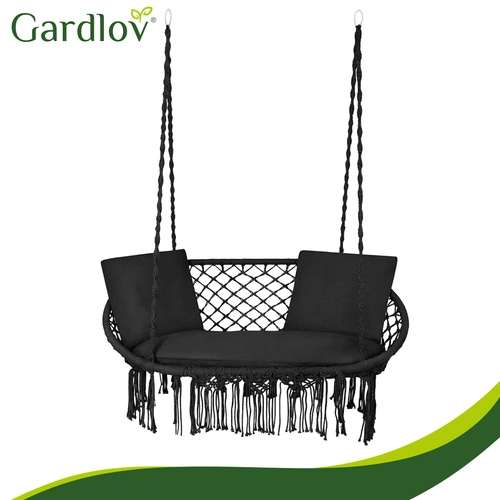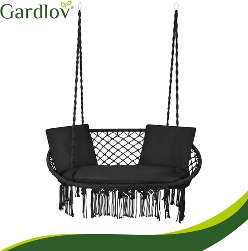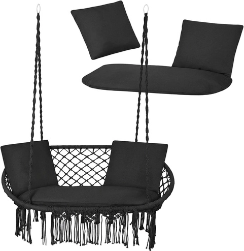Miękkie i przestronne poduszki do podwójnego fotela wiszącego typu bocianie gniazdo marki GARDLOV zapewnią maksymalny komfort na zewnątrz i w domu. Zestaw zawiera duże siedzisko i 2 miękkie jaśki dla podparcia pleców i głowy, ma sprężyste wypełnienie, trwały pokrowiec i można go prać w pralce w 30 °C. Elegancki czarny kolor łatwo komponuje się z nowoczesnymi tarasami, balkonami i ogrodami.