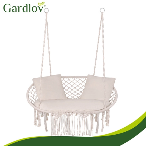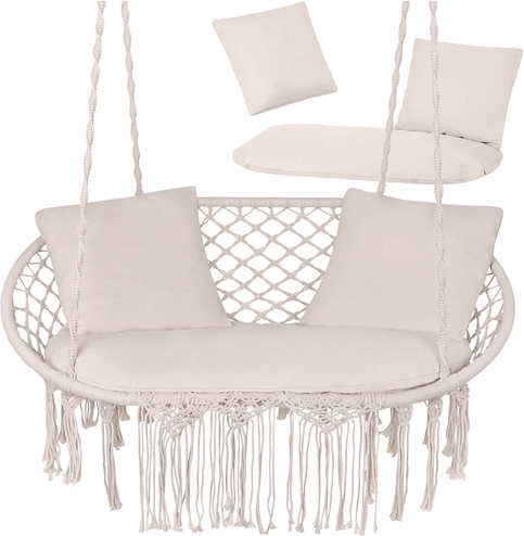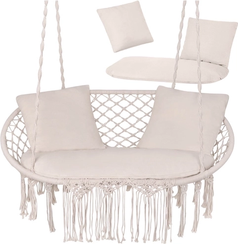 Zmieni swoje wiszące krzesło w prawdziwą oazę relaksu. Dwuczęściowe siedzisko i dwie kwadratowe poduszki wypełniają przestrzeń do siedzenia, zapewniając stabilność i miękki komfort podczas odpoczynku we dwoje. Uniwersalny design i trwałe materiały sprawdzą się w ogrodzie, na tarasie, balkonie oraz we wnętrzach.