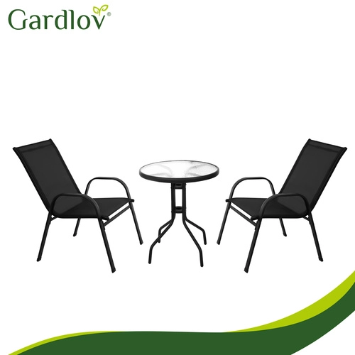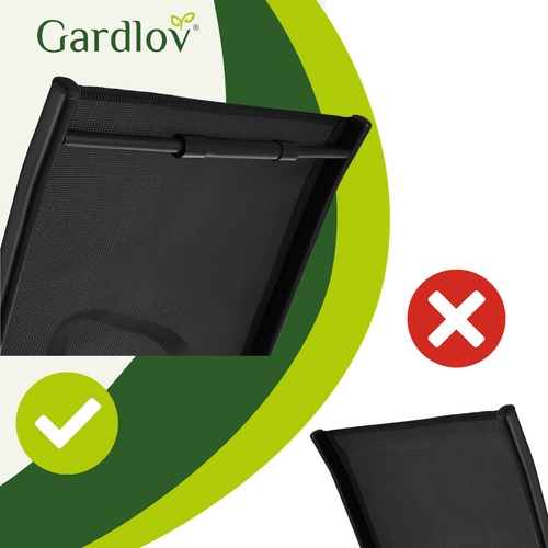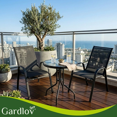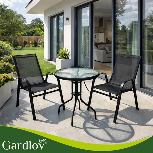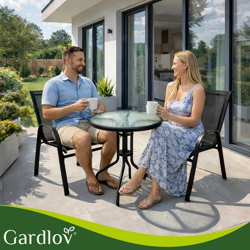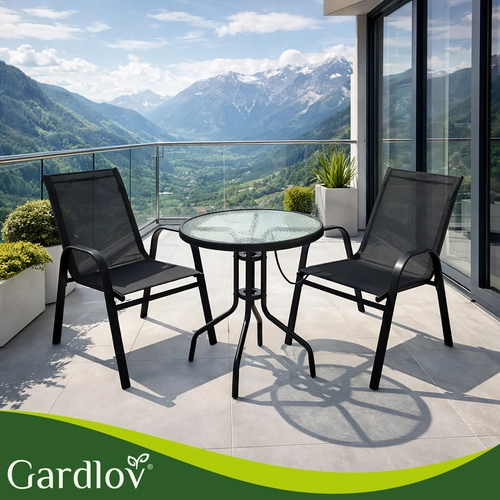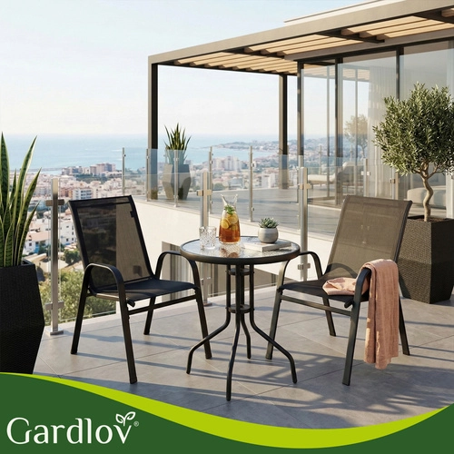 Elegancki zestaw balkonowy GARDLOV łączy nowoczesny wygląd i długą żywotność. Żelazna rama z lakierem proszkowym zapewnia stabilność i ochronę przed korozją, a przewiewne siedziska przyjemnie dopasowują się do ciała. Teksturowany blat z 5‑mm hartowanego szkła dodaje stolikowi bezpieczeństwa i stylu.