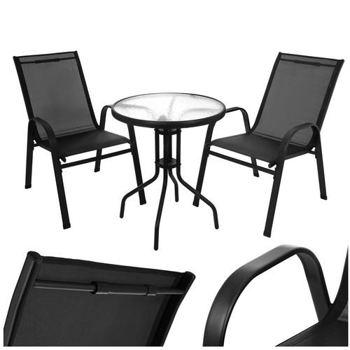 Stwórz przytulne miejsce dla dwojga na balkonie, tarasie lub w ogrodzie. Ten praktyczny 3‑częściowy zestaw bistro z okrągłym stolikiem z hartowanego szkła i dwoma przewiewnymi krzesłami oferuje stabilną metalową konstrukcję z lakierem proszkowym, jest wodoodporny, odporny na promieniowanie UV i łatwy w utrzymaniu. Idealny na poranną kawę, popołudniowy relaks i wieczorne spotkania.