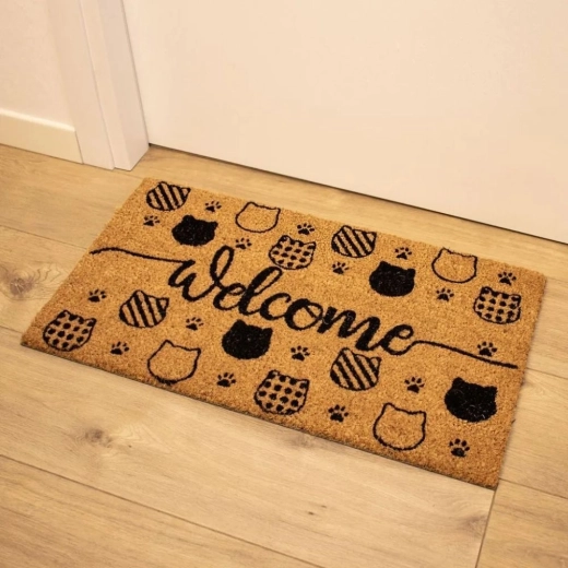 Wycieraczka Welcome Cats łączy zabawny koci motyw z praktyczną ochroną przed brudem. Idealna do głównych i bocznych wejść, gdzie zatrzymuje kurz i drobne zanieczyszczenia z obuwia, a jednocześnie wita gości miłym napisem „Welcome”.