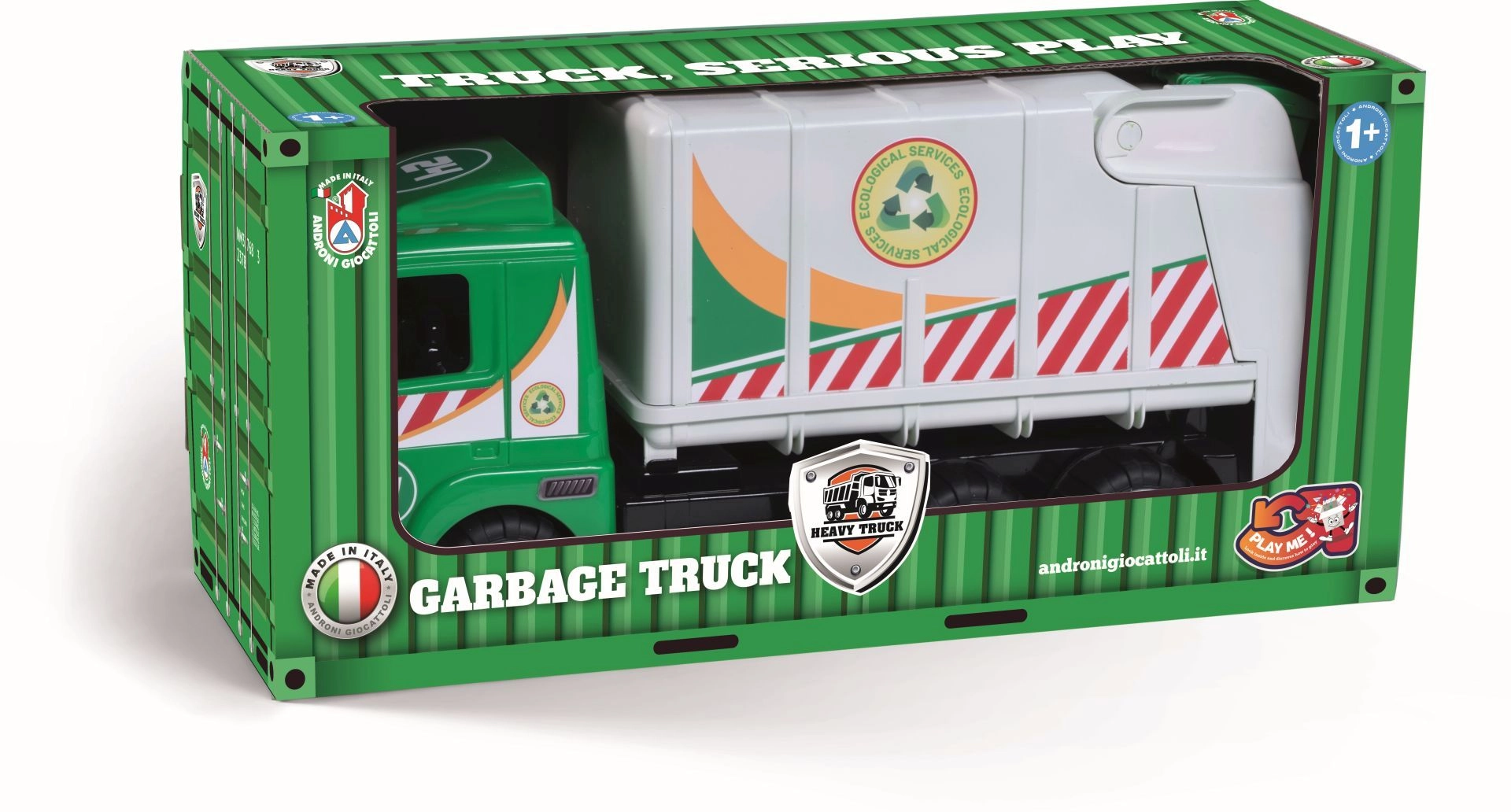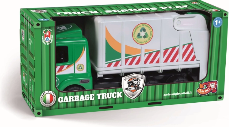 Auto jest częścią serii Heavy Trucks i wyróżnia się trwałą konstrukcją z wysokiej jakości tworzyw produkowanych we Włoszech. Jest bezpieczne i dostosowane do najmłodszych dzieci od 12 miesięcy, wspiera małą motorykę, koordynację ręka–oko oraz zabawy w role związane ze sprzątaniem i recyklingiem.