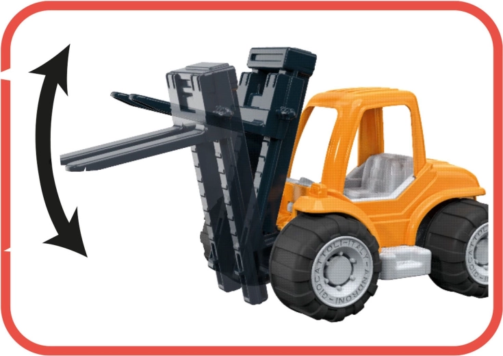 Ruchome widły pozwalają dzieciom podnosić i przewozić drobne przedmioty oraz dołączone bloczki, wspierając koordynację i motorykę małą.