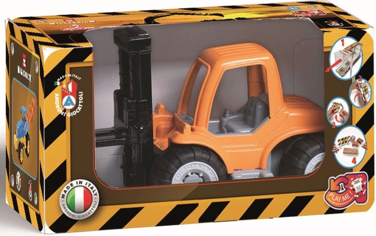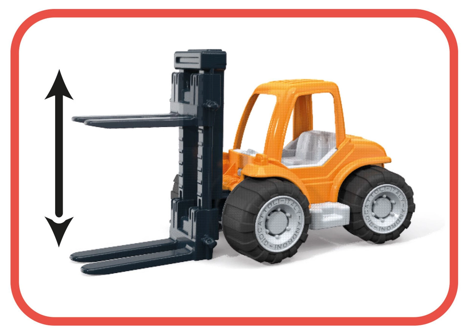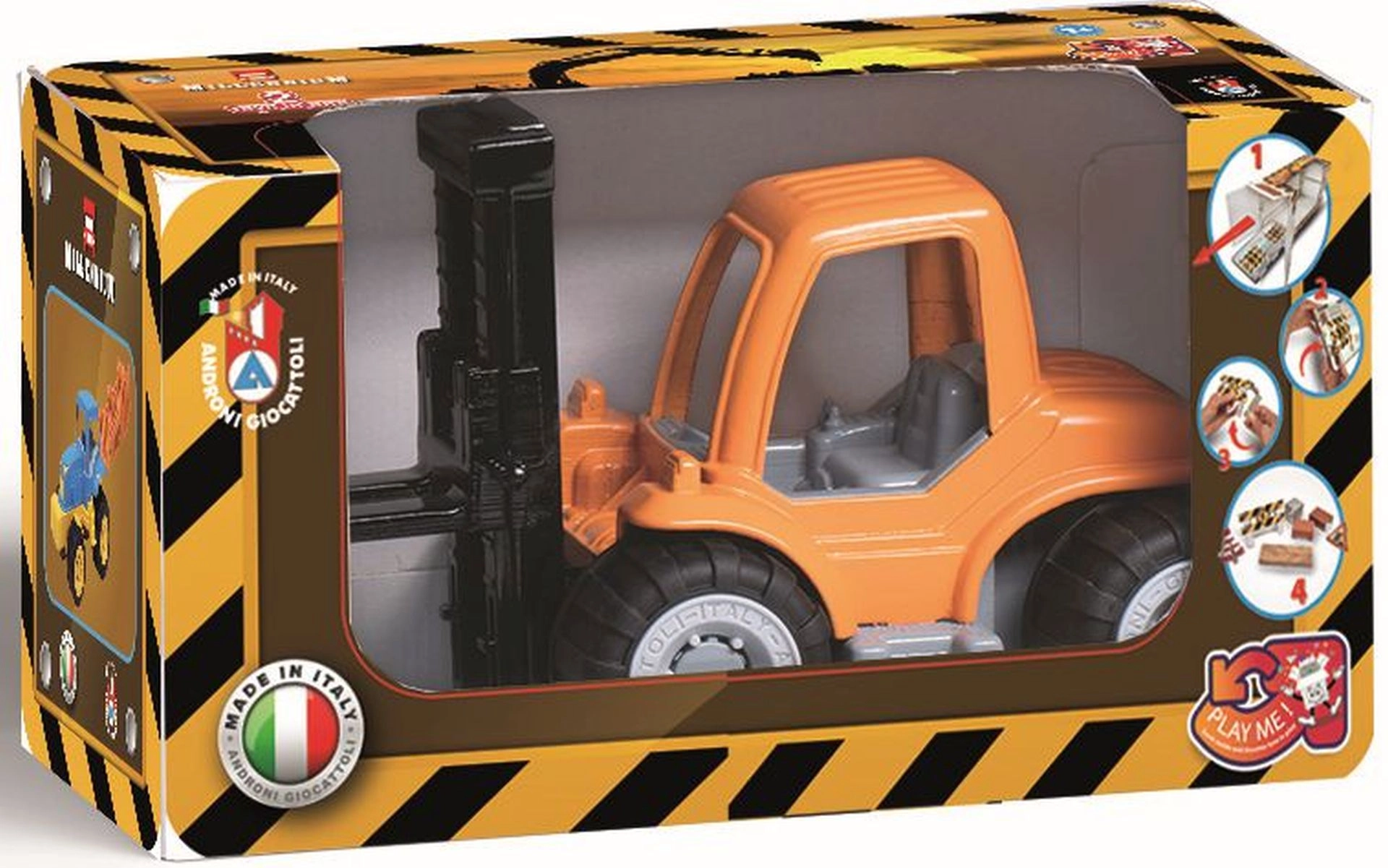 Solidny plastikowy wózek widłowy z linii Millennium marki Androni ucieszy małych budowniczych już od 10 miesięcy. Ma ruchomy podnośnik wideł, gumowane koła dla stabilności i jest dostarczany z kartonowymi bloczkami do tworzenia scenariuszy zabaw. Wyprodukowano we Włoszech z wysokiej jakości tworzyw sztucznych.
