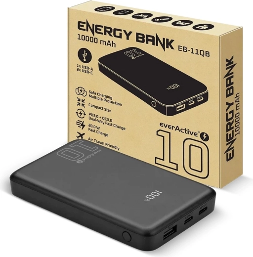 Kompaktowy powerbank o pojemności 10 000 mAh oferuje szybkie ładowanie 20 W przez USB‑C, trzy wyjścia (2× USB‑C, 1× USB‑A), wsparcie PD3.0/QC4+ oraz czytelny wyświetlacz LCD stanu baterii. Dzięki funkcji pass‑through i trybowi Always‑On bezpiecznie naładuje także urządzenia o niskim poborze, takie jak smartwatche czy bezprzewodowe słuchawki.