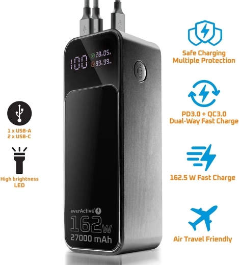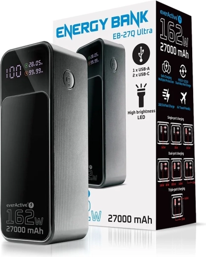 Ta premium powerbank została zaprojektowana z myślą o maksymalnej elastyczności i wydajności. Główny port USB‑C (C1) dostarcza do 140 W nawet przy jednoczesnym ładowaniu innych urządzeń, więc bez kompromisów zasili laptopy i wymagającą elektronikę. Łączna moc do 162,5 W zapewnia szybkie uzupełnienie energii dla wielu urządzeń naraz.