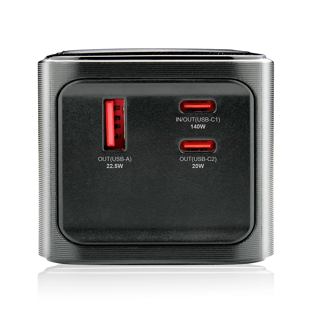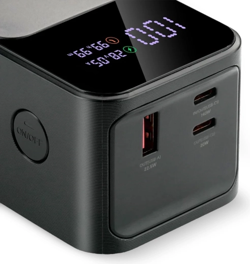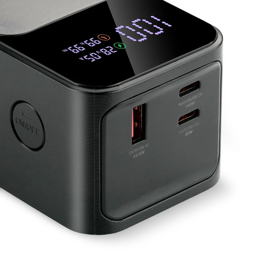 Inteligentny wyświetlacz LCD pokazuje procentowy poziom naładowania, napięcie (V), prąd (A) oraz pozostały czas ładowania/pracy. Funkcja pass‑through umożliwia jednoczesne ładowanie powerbanku i podłączonych urządzeń bez przerw. Dzięki wsparciu PD 3.1 AVS 140 W, PPS, QC4+, QC3.0, Apple, Samsung AFC, Huawei FCP/SCP zapewniona jest szeroka kompatybilność.