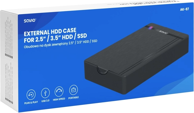 Zmień wewnętrzny dysk w przenośną pamięć masową w mgnieniu oka. Zewnętrzna obudowa AK-87 oferuje Plug & Play bez instalacji sterowników, USB 3.0 z prędkością do 5 Gb/s, obsługę SSD/HDD SATA 2.5" i 3.5" oraz pojemność do 16 TB. Lekka i kompaktowa konstrukcja z zasilaczem dla dysków 3.5" zapewnia stabilny i szybki transfer danych w systemach Windows, macOS i Linux.