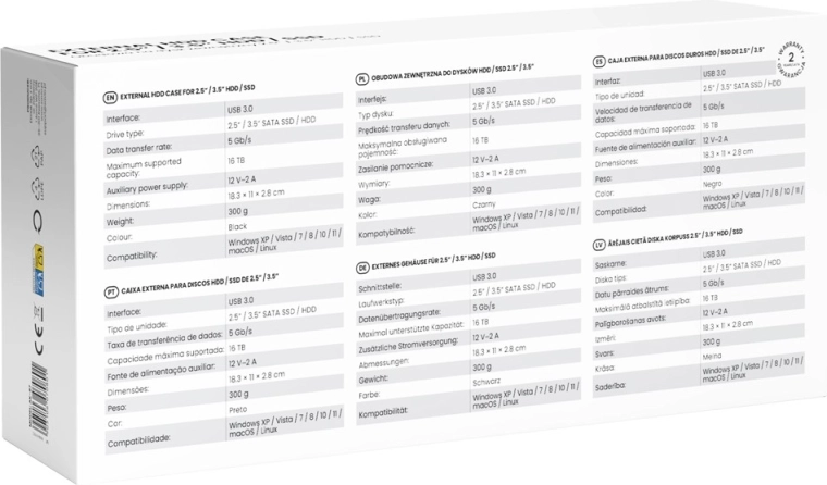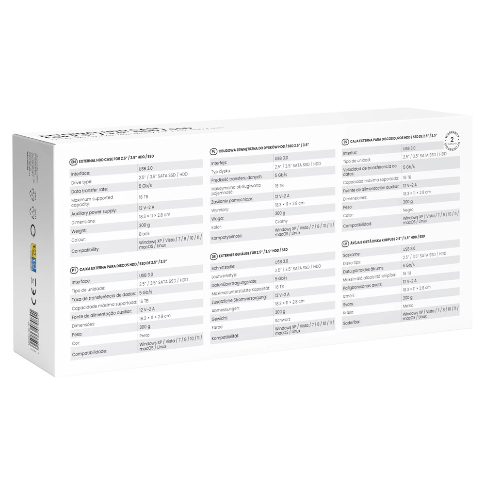 Urządzenie jest uniwersalne i bezproblemowo działa w środowiskach Windows (XP/ Vista/ 7/ 8/ 10/ 11), macOS i Linux. Obsługuje dyski z interfejsem SATA w formatach 2.5" i 3.5", zarówno tradycyjne HDD, jak i szybkie oraz ciche SSD. Dla stabilnej pracy dysków 3.5" w zestawie znajduje się zasilacz 12 V / 2 A.
