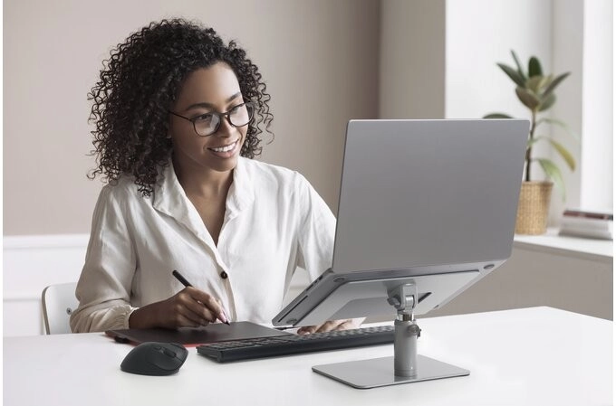 - Ergonomiczna regulacja – uniesienie ekranu do wysokości oczu zmniejsza napięcie karku i pleców.