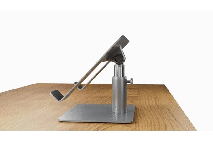 Płynna regulacja bez użycia narzędzi pozwala precyzyjnie dostroić wysokość 151–200 mm i kąt 0–45°. Podstawa tworzy praktyczną przestrzeń na schowaną klawiaturę i peryferia, dzięki czemu łatwiej utrzymać porządek na biurku.