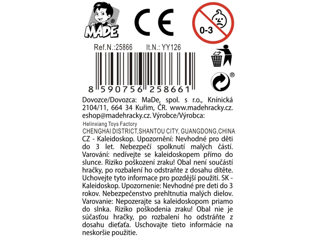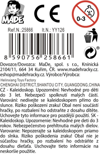 Odkryj magię kolorowych wzorów z tym plastikowym kalejdoskopem dla dzieci od 3 lat. Oferuje 5 różnych kolorowych motywów, nie wymaga baterii i jest gotowy do natychmiastowej zabawy w dowolnym miejscu. Dzięki kompaktowym wymiarom 4,5 × 4,5 × 19,5 cm doskonale pasuje do dziecięcych rąk i sprawdzi się jako atrakcyjny dodatek do display boxu w sklepach.