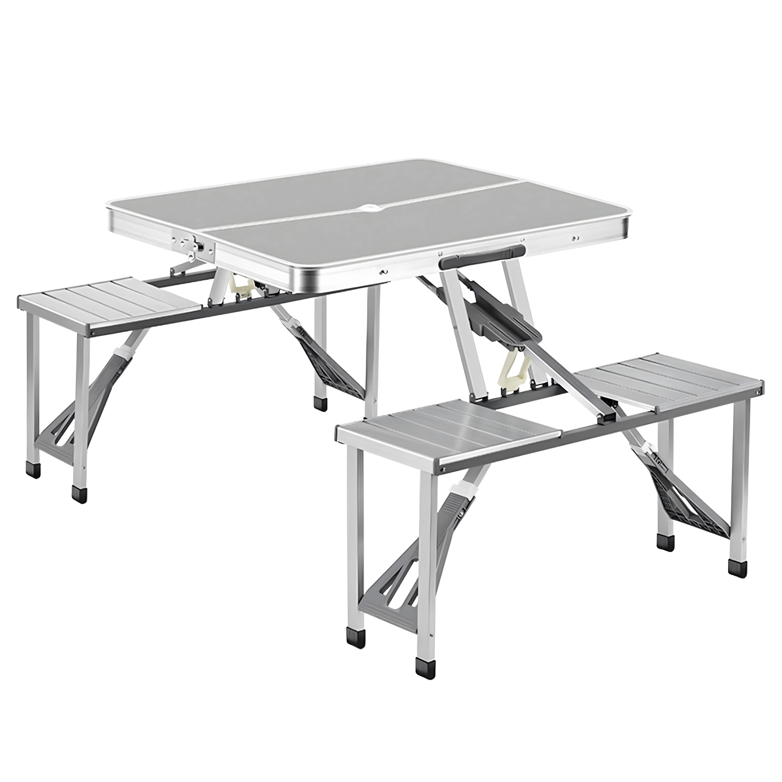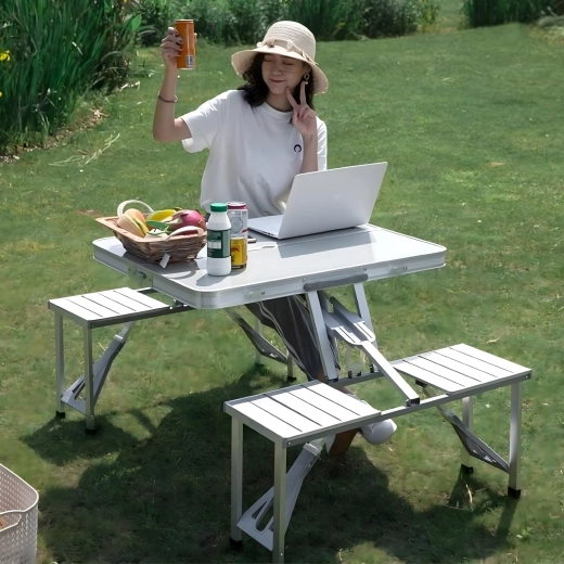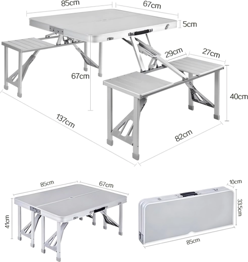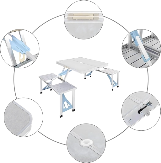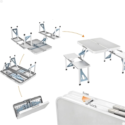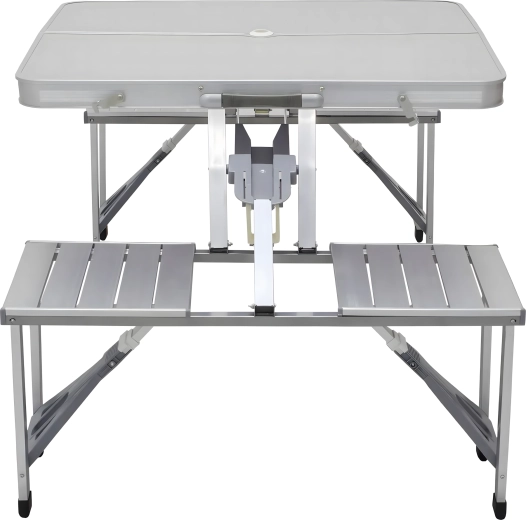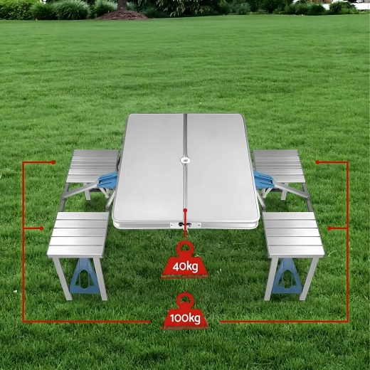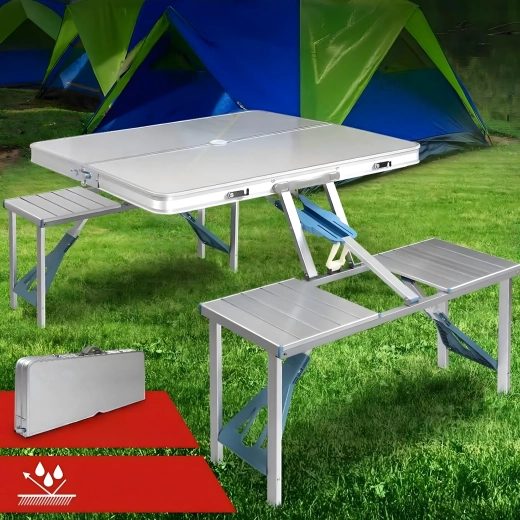 Praktyczny i lekki składany stół kempingowy z 4 zintegrowanymi siedziskami jest idealny na piknik, biwak, plażę i do ogrodu. Wytrzymałe połączenie aluminium i PVC gwarantuje długą żywotność, a po złożeniu cały zestaw zmienia się w kompaktową walizkę z uchwytem. Stół ma otwór na parasol, dzięki czemu zapewnia przyjemny cień nawet w upalne dni.