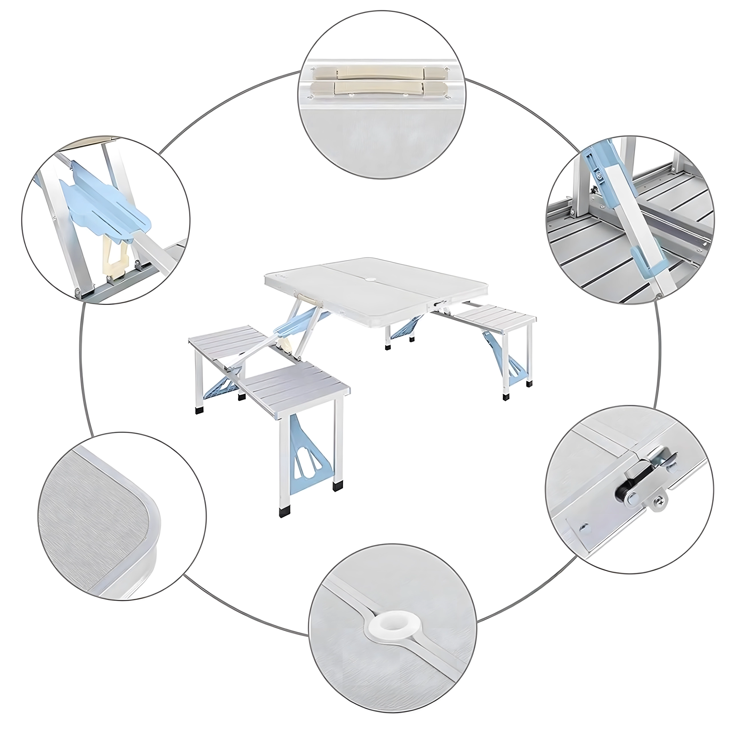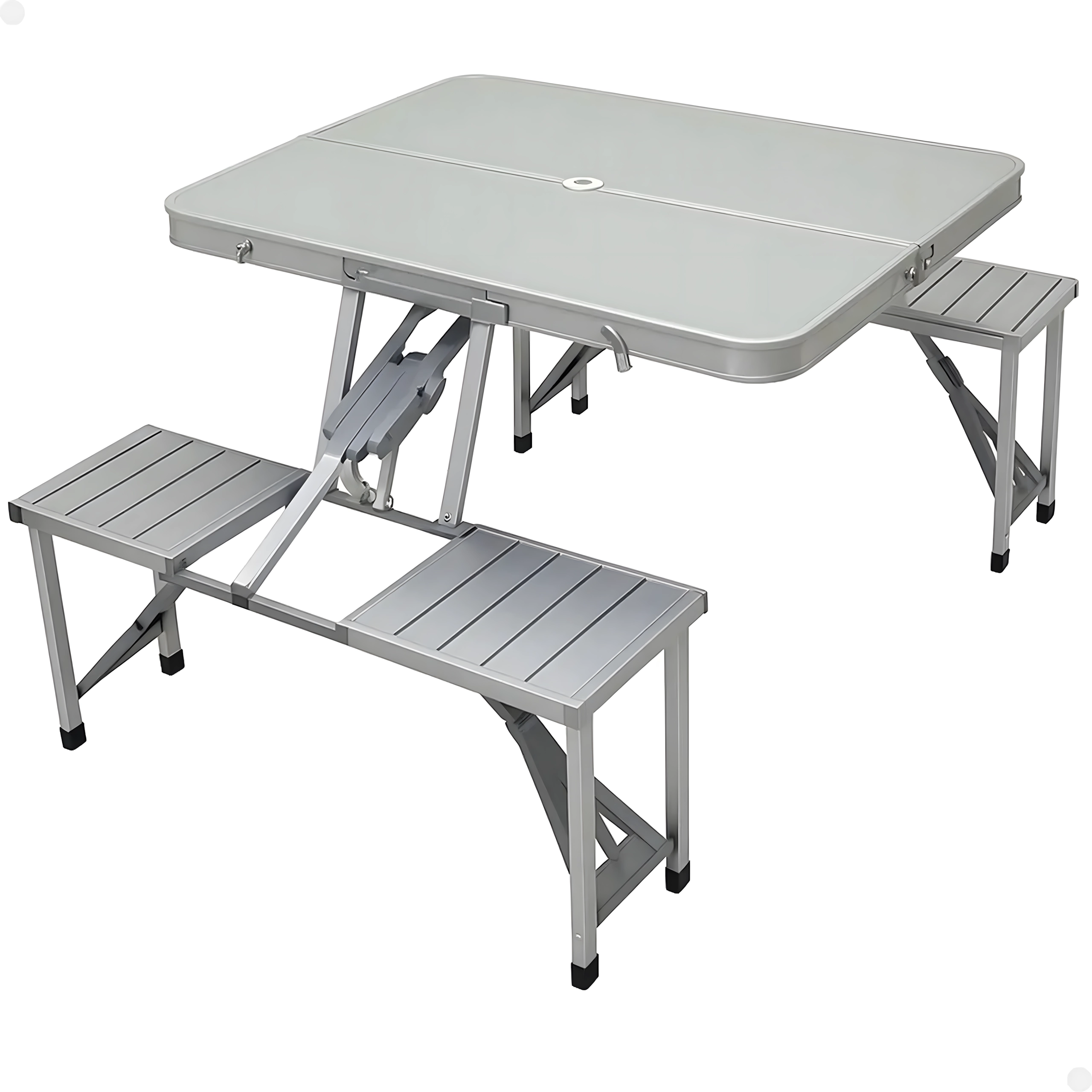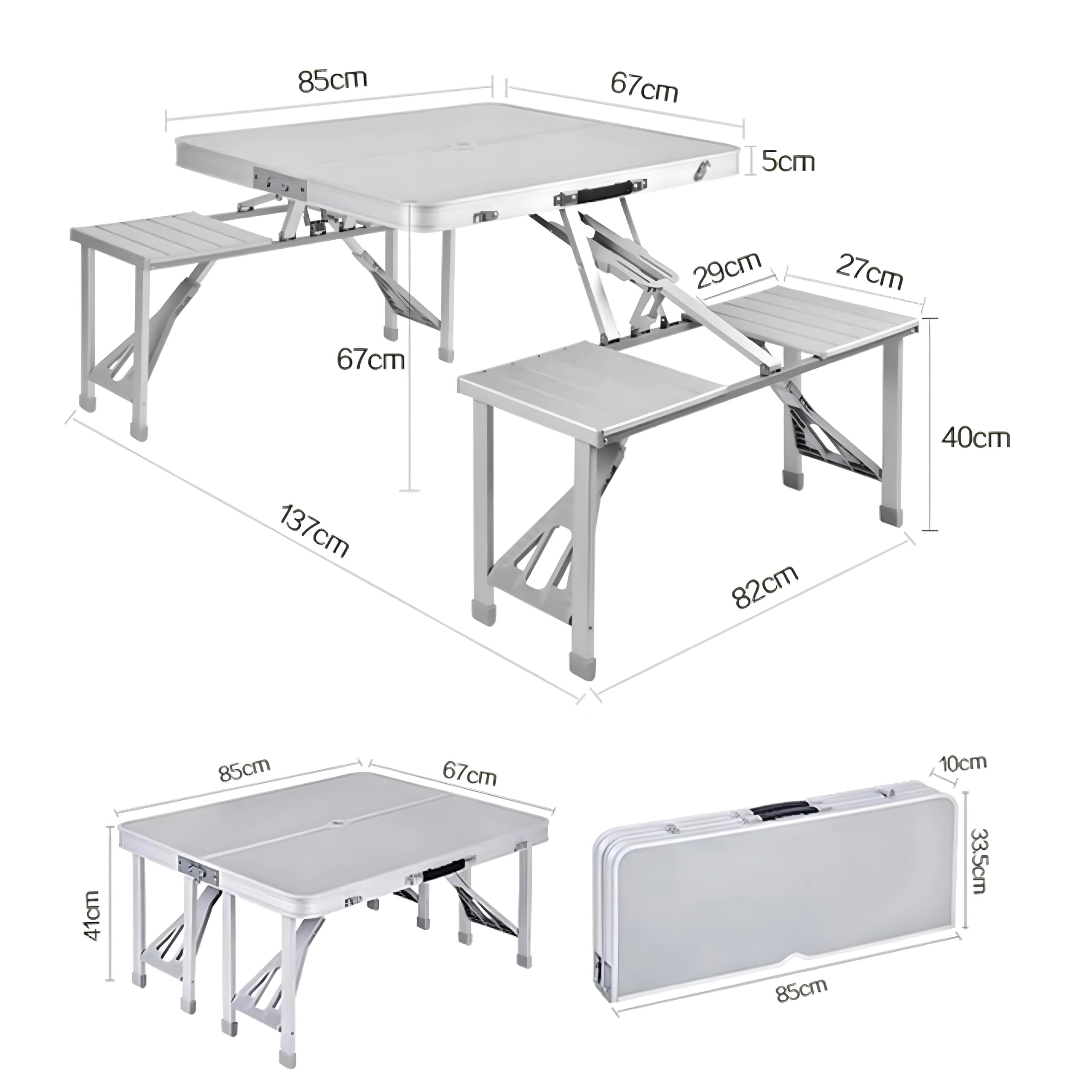 Praktyczny i lekki składany stół kempingowy z 4 zintegrowanymi siedziskami jest idealny na piknik, biwak, plażę i do ogrodu. Wytrzymałe połączenie aluminium i PVC gwarantuje długą żywotność, a po złożeniu cały zestaw zmienia się w kompaktową walizkę z uchwytem. Stół ma otwór na parasol, dzięki czemu zapewnia przyjemny cień nawet w upalne dni.