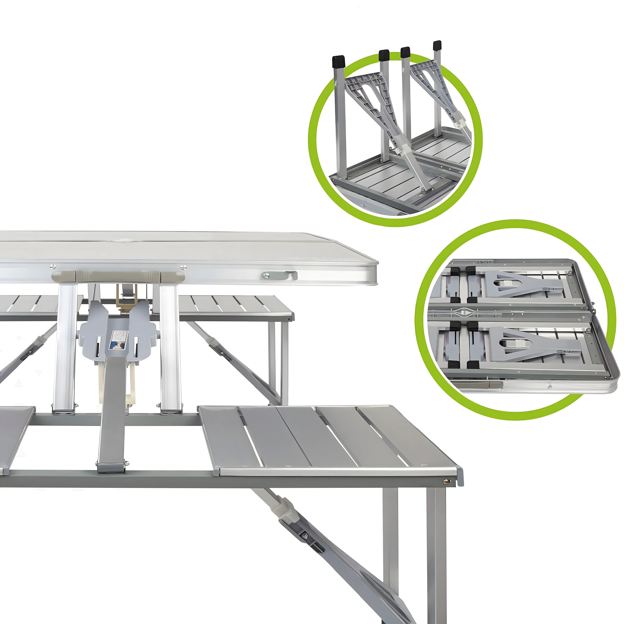 Ciesz się wygodnym posiłkiem na świeżym powietrzu z praktycznym zestawem dla czterech osób. Stabilna konstrukcja z krzyżowym wzmocnieniem i antypoślizgowymi stopkami zapewnia niezawodną stabilność na trawie i twardym podłożu. Po złożeniu stół i ławki blokują się w poręcznej walizce, którą łatwo włożysz do auta lub szafy.