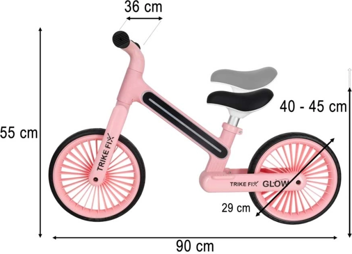 - Rośnie razem z dzieckiem – szeroki zakres regulacji siodełka dla wzrostu ok. 85–110 cm.
