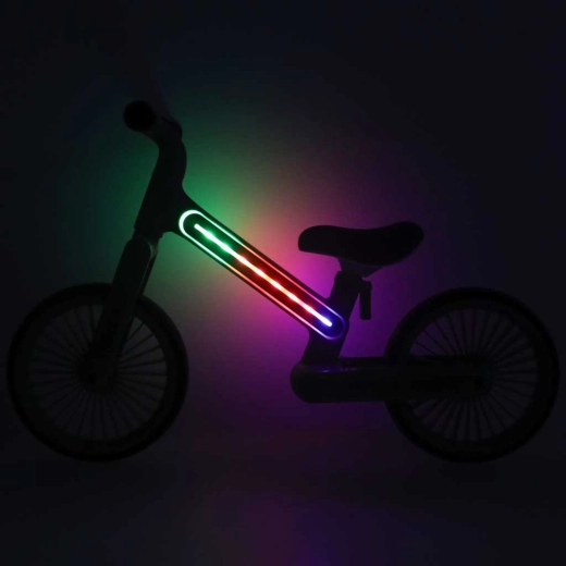 Stylowy rowerek biegowy dla dzieci z podświetlaną ramą LED i aż 20 trybami świecenia dla lepszej widoczności i zabawy. Lekka konstrukcja z nylonu, bezobsługowe koła EVA 12" oraz regulowane siodełko zapewniają wygodną i bezpieczną jazdę. Idealny pierwszy rower do naturalnego treningu równowagi i koordynacji bez bocznych kółek.