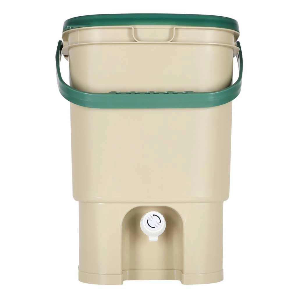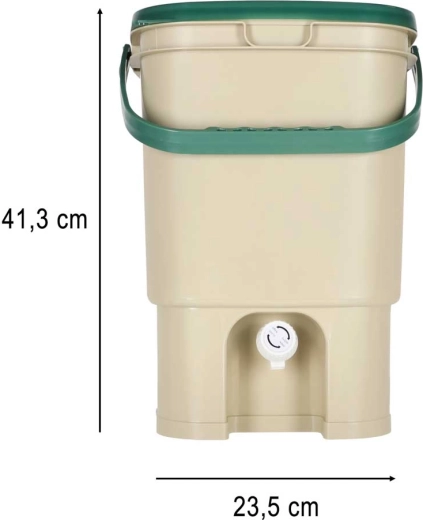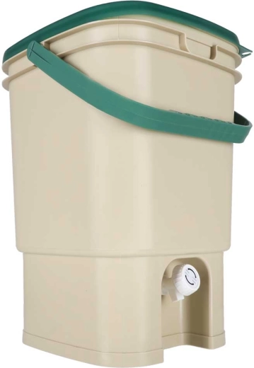 Praktyczny kompostownik do mieszkania i domu pozwala higienicznie gromadzić organiczne resztki (skórki, fusy po kawie, torebki herbaty, skorupki jaj itp.) w jednym miejscu. Solidna pokrywa ogranicza rozchodzenie się zapachów, wewnętrzna perforowana wkładka oddziela materiał stały od cieczy, a dolny kranik ułatwia spuszczanie bogatego w składniki odżywcze wyciągu.