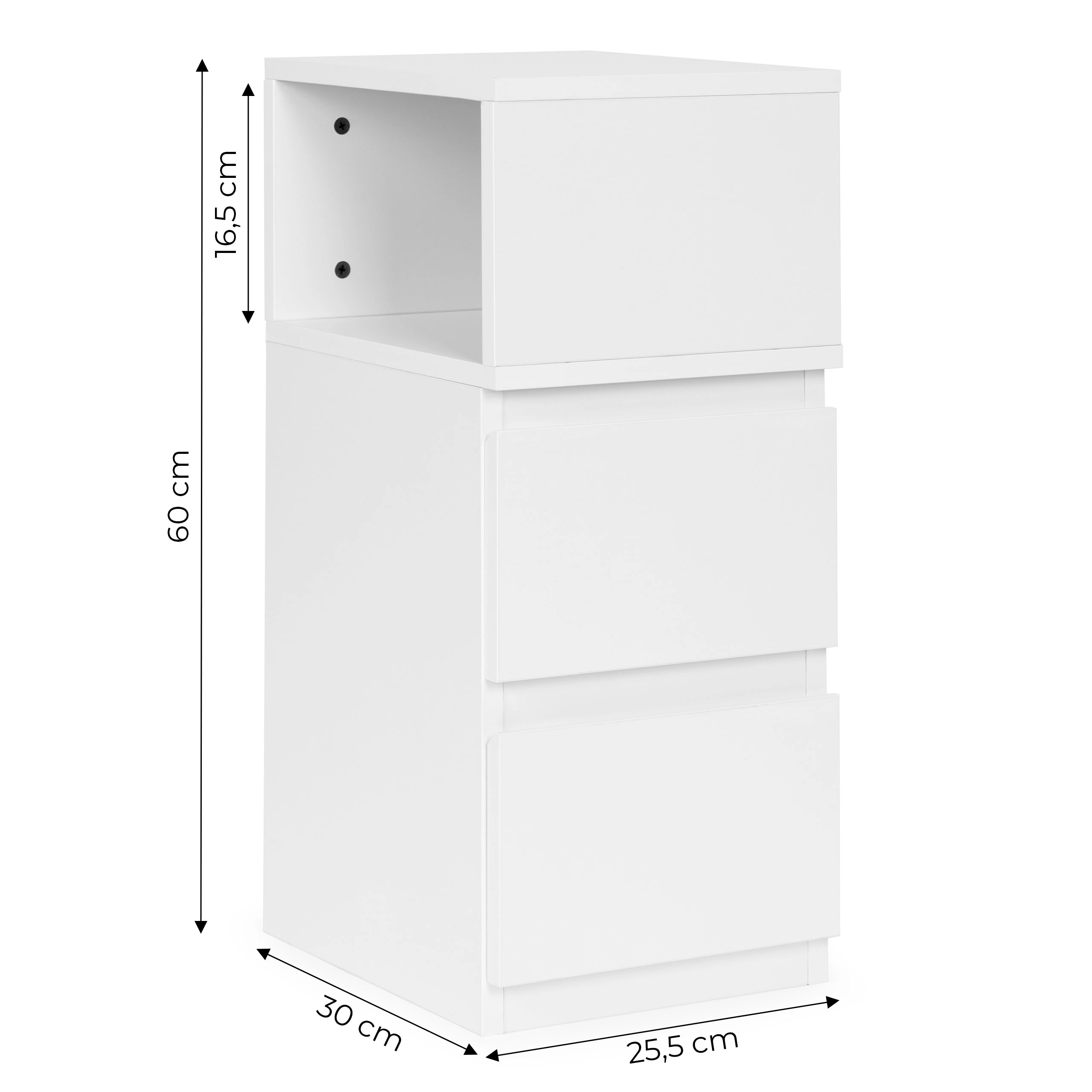 Przemyślane rozwiązania do przechowywania obejmują 2 pojemne szuflady na drobiazgi oraz otwartą półkę na to, co chcesz mieć pod ręką. Stolik wykonano z trwałej płyty MDF, dzięki czemu jest stabilny i niezawodny w codziennym użytkowaniu. Minimalistyczny, kompaktowy design z łatwością wpasuje się w nowoczesne i mniejsze wnętrza.