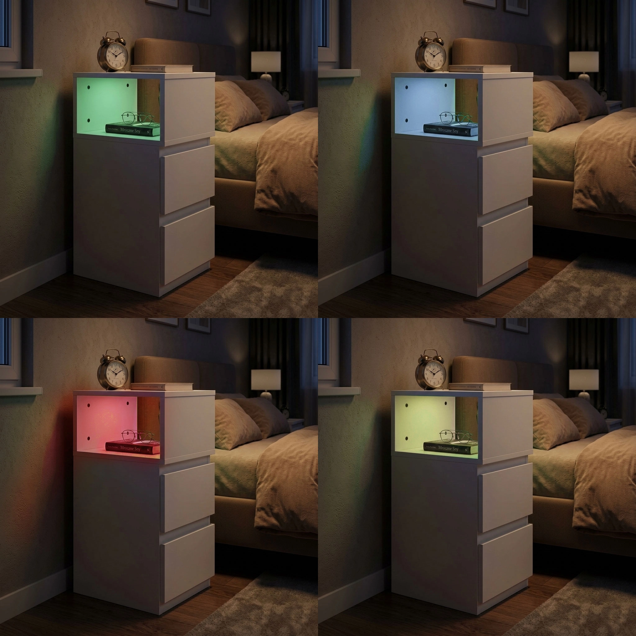 Dopełnij atmosferę sypialni stylowym stolikiem nocnym ModernHome. Zintegrowane podświetlenie RGB LED w otwartej przegrodzie wprowadza spokój do czytania i wieczornego relaksu. Sterowanie jest proste – za pomocą pilota wybierzesz 16 kolorów i efekty (Flash, Strobe, Fade, Smooth), a aplikacja mobilna zapewni jeszcze szerszą paletę oraz płynną regulację jasności.