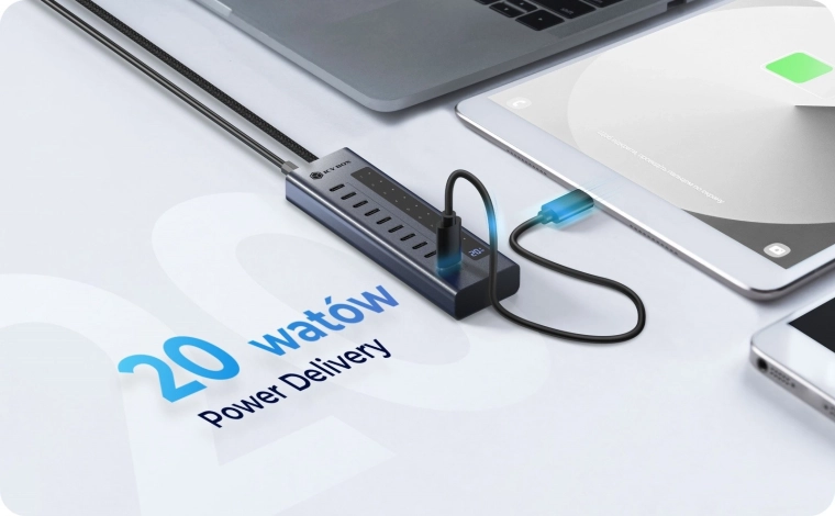 Unikalny dedykowany port USB-C z Power Delivery 20 W obsługuje jednocześnie dane 10 Gb/s i szybkie ładowanie telefonu lub tabletu. Zintegrowany wyświetlacz LED w czasie rzeczywistym pokazuje moc wyjściową PD, dzięki czemu masz podgląd poboru energii jednym rzutem oka.