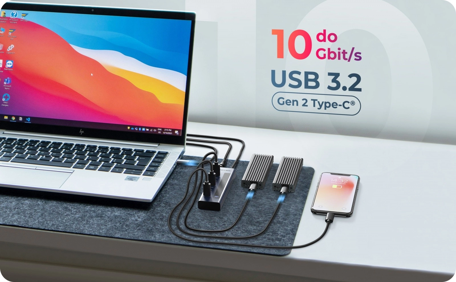 9× USB-C 3.2 Gen 2 dla danych, 1× USB-C z PD 20 W i danymi