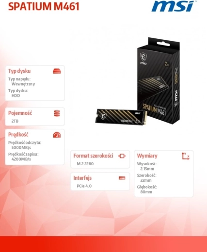 MSI SPATIUM M461 oferuje nowoczesną pamięć masową o wysokiej przepustowości PCIe 4.0 dla błyskawicznego ładowania systemu, gier i wymagających aplikacji. Technologia 3D NAND łączy kompaktowe wymiary z wysoką pojemnością, zapewniając do 2 TB przestrzeni bez kabli, bezpośrednio w slocie M.2.