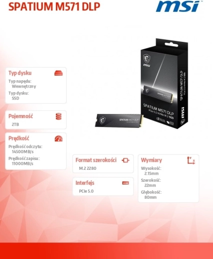 MSI SPATIUM M571 DLP przesuwa granice szybkości dzięki standardowi PCIe 5.0 NVMe. Wysokie prędkości sekwencyjne zapewniają błyskawiczne uruchamianie systemu, natychmiastową reakcję aplikacji i krótsze czasy ładowania gier. Kompaktowy format M.2 2280 sprawdzi się w nowoczesnych desktopach i laptopach.