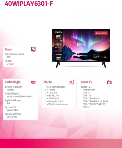 ALLVIEW 40" LED TV łączy elegancki, smukły design z inteligentnymi funkcjami webOS. Otrzymujesz płynne odtwarzanie treści online, przejrzysty ekran startowy i szybki dostęp do najczęściej używanych aplikacji jednym przyciskiem. Dzięki energooszczędnemu podświetleniu LED telewizor jest wydajny podczas codziennego oglądania.