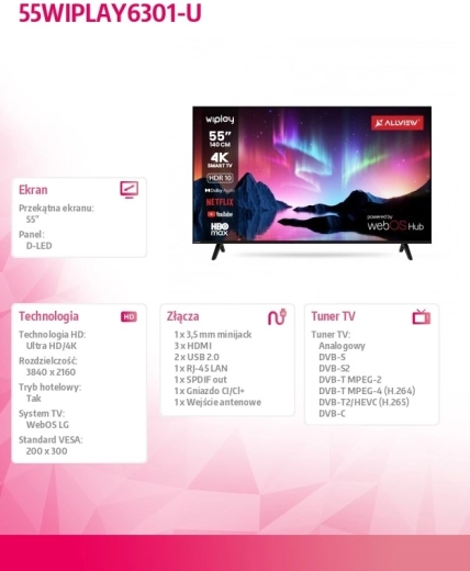 Wejdź do świata domowej rozrywki z 55-calowym ekranem, który zapewnia szczegółowy obraz i płynne sterowanie. Intuicyjne webOS udostępnia ulubione serwisy streamingowe, takie jak Netflix, HBO Max, Disney+ i YouTube, jednym kliknięciem. Eleganckie cienkie ramki i smukły profil idealnie pasują do nowoczesnych wnętrz.