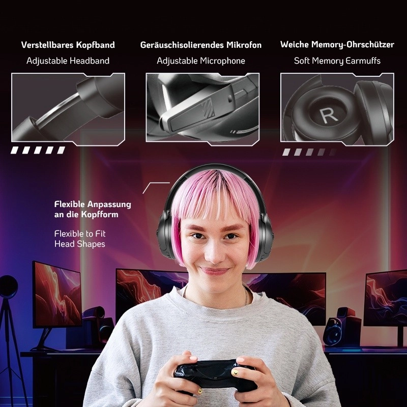 Miękkie nauszniki z pianką memory i regulowany pałąk dopasowują się do kształtu głowy, gwarantując całodzienny komfort.