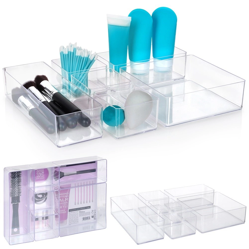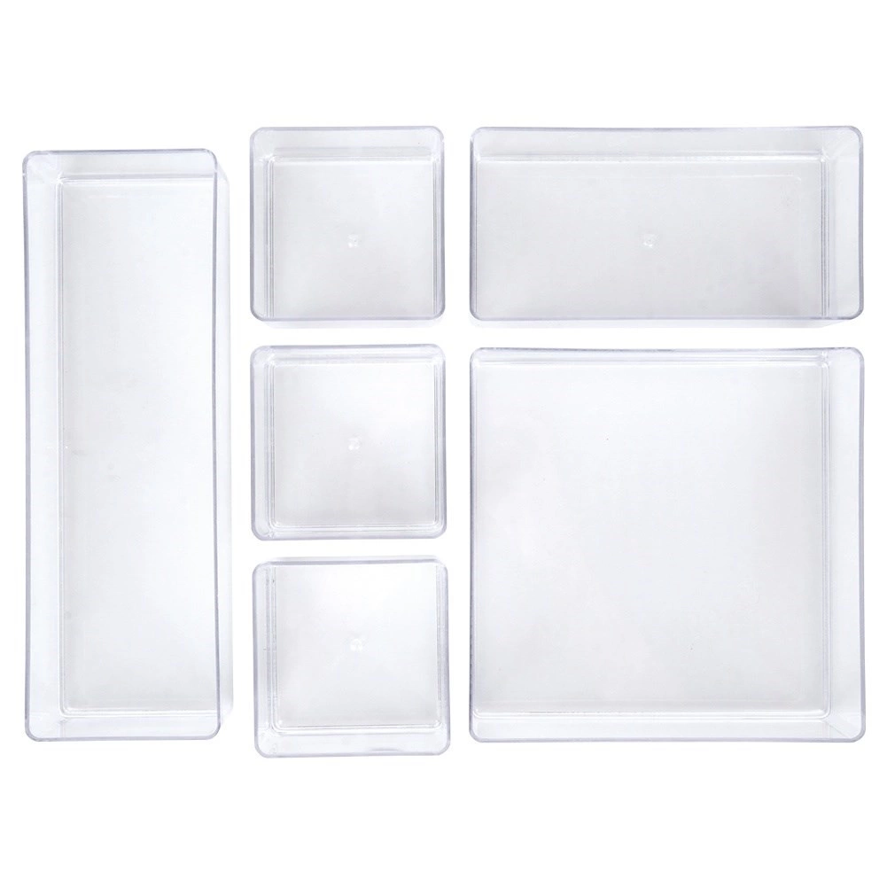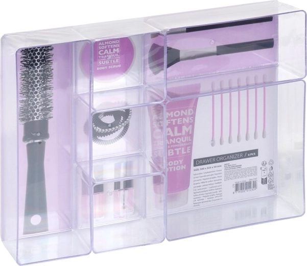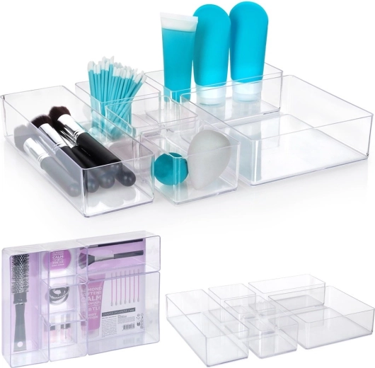 Ten praktyczny zestaw organizerów zapewnia przejrzyste przechowywanie kosmetyków, biżuterii i drobnych akcesoriów. Sześć oddzielnych pudełek w różnych wymiarach pozwala ułożyć przestrzeń dokładnie według Twoich potrzeb – na blacie stołu, toaletce oraz wewnątrz szuflad.