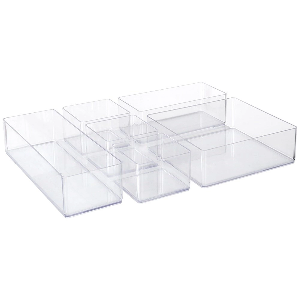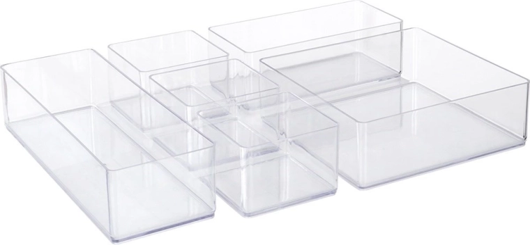 Zestaw zawiera sześć pudełek w różnych wymiarach, które łatwo ułożysz w szufladzie lub na blacie, tworząc system dokładnie według własnych potrzeb.